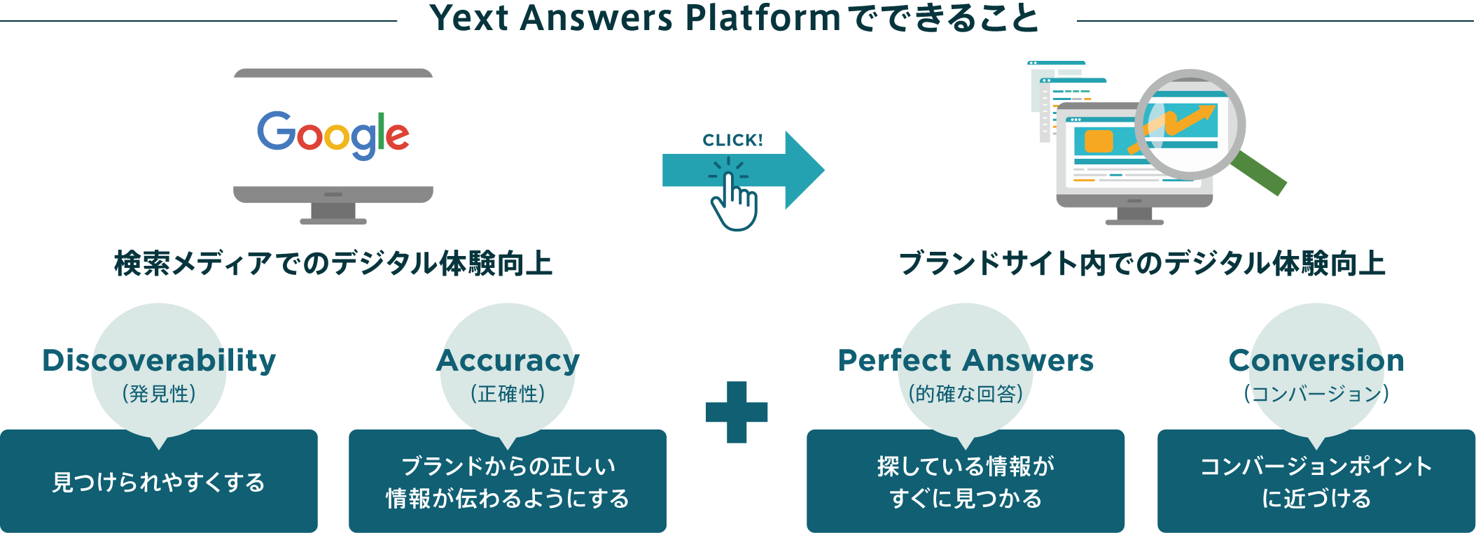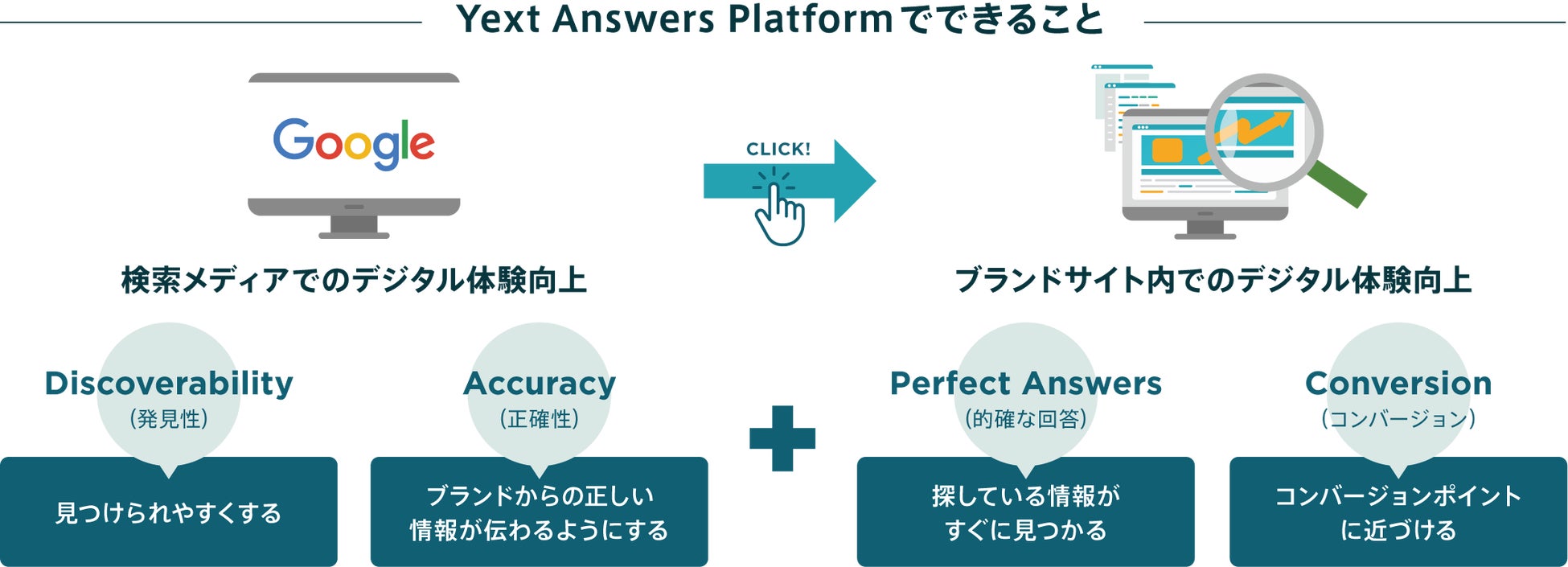 Yextのデジタル体験プラットフォームを活用すれば、コーポレートサイトの各種コンテンツを検索エンジンに正しくかつ分かりやすく伝え、ユーザーが求める的確な検索結果を表示することができます。さらには、AIを活用したサイト内検索による検索精度の向上、Google検索に最適化したWebページの構築、社内コンテンツの一元管理など、あらゆる検索の場面で最適な情報を発信し、ユーザーのみならず、社員、パートナーにおいても適切かつ実用的な答えを提供します。これにより、ビジネス機会の創出ならびに社員の業務効率向上を実現します。