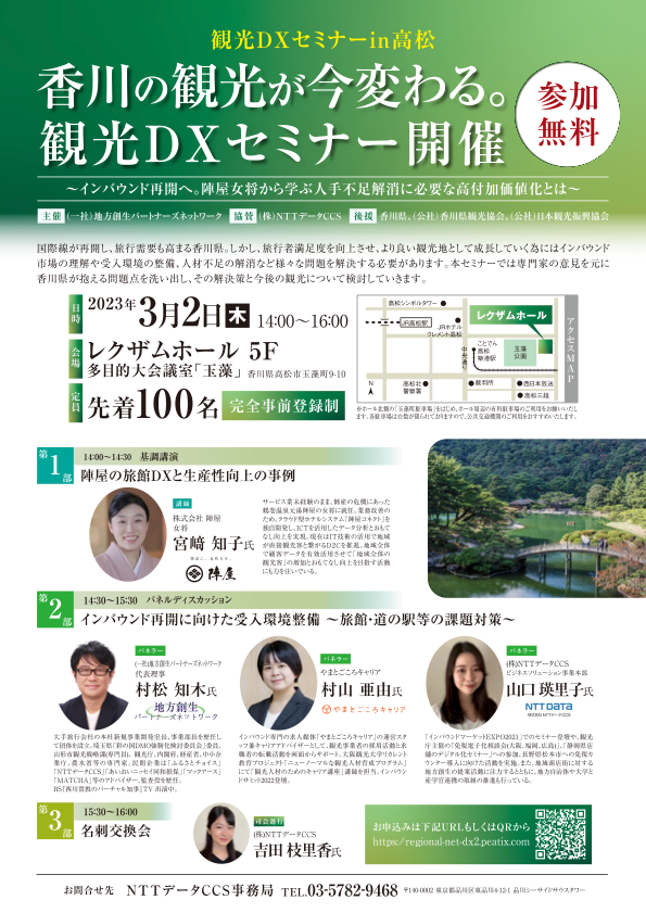 ⼀般社団法⼈地⽅創⽣パートナーズネットワーク(本社:東京都渋⾕区/代表理事:村松 知⽊)は、株式会社NTTデータCCS の協賛、香川県、(公社)香川県観光協会、(公社)日本観光振興協会の後援により、3月2日(木)「観光DXセミナー in 高松」を開催します。基調講演には、旅館経営の先進DX事例として知られる鶴巻温泉元湯陣屋の女将、宮崎知子氏が登壇。多彩なゲストによるパネル・ディスカッションと合わせて、需要回復期に観光業界の課題である人手不足に対し、DX(デジタル・トランスフォーメーション)による生産性向上や高付加価値化を考えていきます。