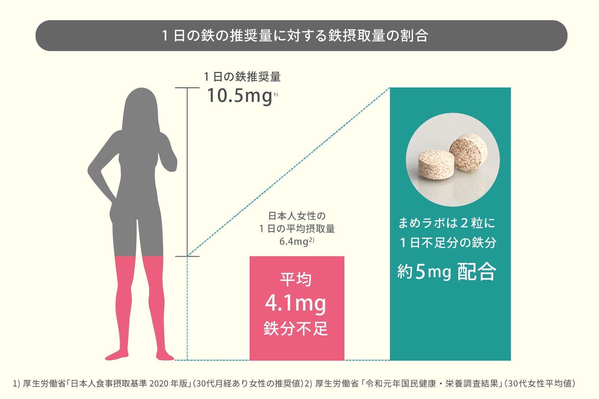 20代〜50代の日本人女性の鉄分の平均摂取量は、推奨摂取量を約4~5mg下回っています。そこで、「まめラボ フェリチン鉄」を普段の食事にプラスすることで摂取の難しい鉄補給を手軽にサポートします。