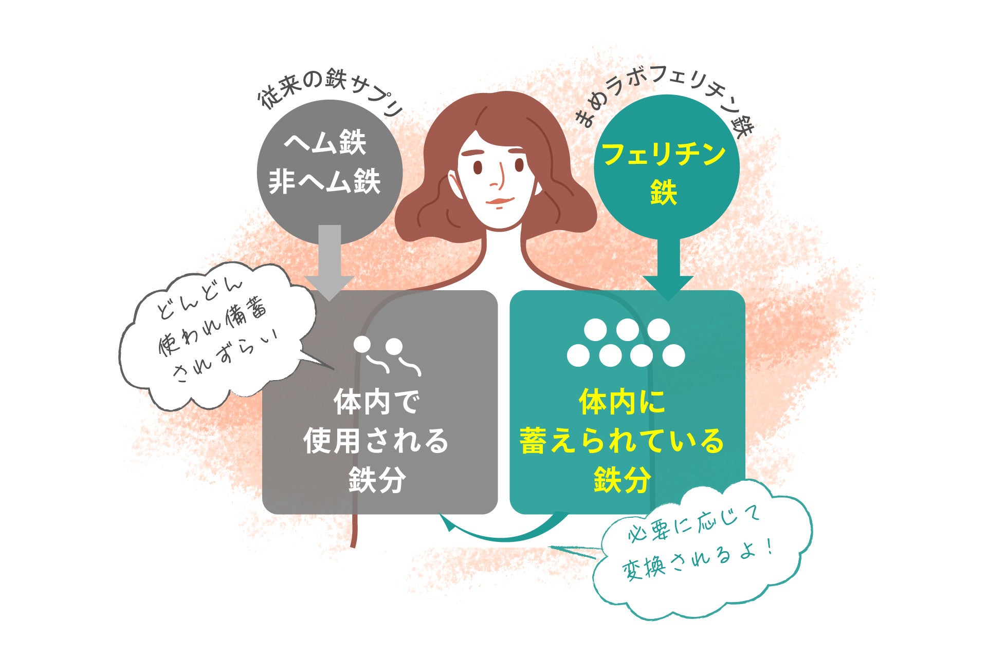 3. 植物性の鉄分(非ヘム鉄)はヘム鉄と比べて吸収率が悪いというデメリットを克服し、食生活の多様性、菜食ブームにも対応した鉄補給が可能です。これまで、ほうれん草などに含まれる植物性の鉄(非ヘム鉄)は吸収率が約2~3%、たいしてレバーなどに含まれるヘム鉄は吸収率が約20~30%とその差が歴然でした。しかし、「まめラボ フェリチン鉄」で採用しているフェリチン鉄は大豆由来の植物性の鉄でありながら、その吸収率は約20~30%とヘム鉄と同等の吸収率とされています。