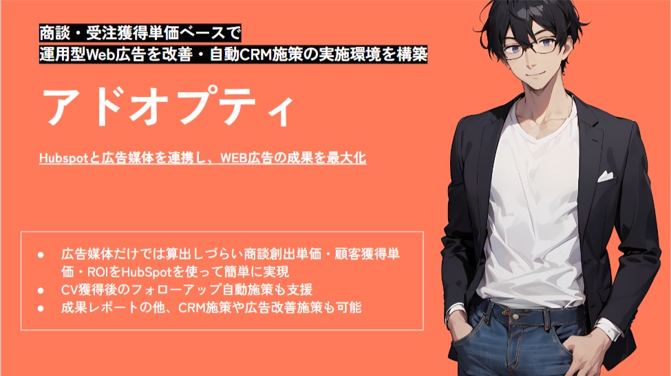 株式会社クリエイティブホープ(代表取締役社長:香取 宜伸、本社:東京都新宿区)は、広告データとCRMデータとを一元管理し広告成果の最大化を実現する新サービス「アドオプティ」を正式にリリースいたします。広告媒体だけでは把握しづらい商談創出・顧客獲得単価の算出や改善をHubSpotを使って簡単に実現します。