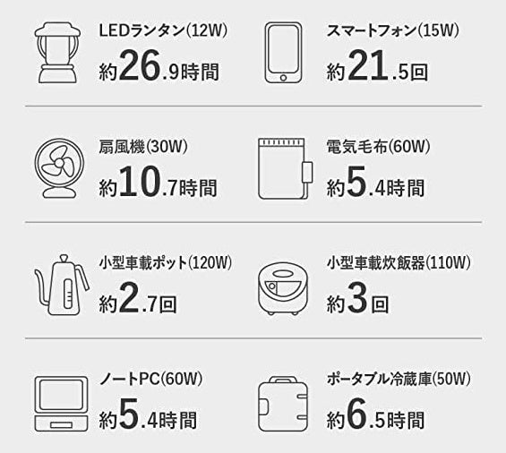 | 出力 | AC×2口 (400W) Type-C×1口 (入出力兼用) USB-A×3口 (12W) シガーソケット×1口 (12V/10A) DCポート×2口 (12V/10A) |