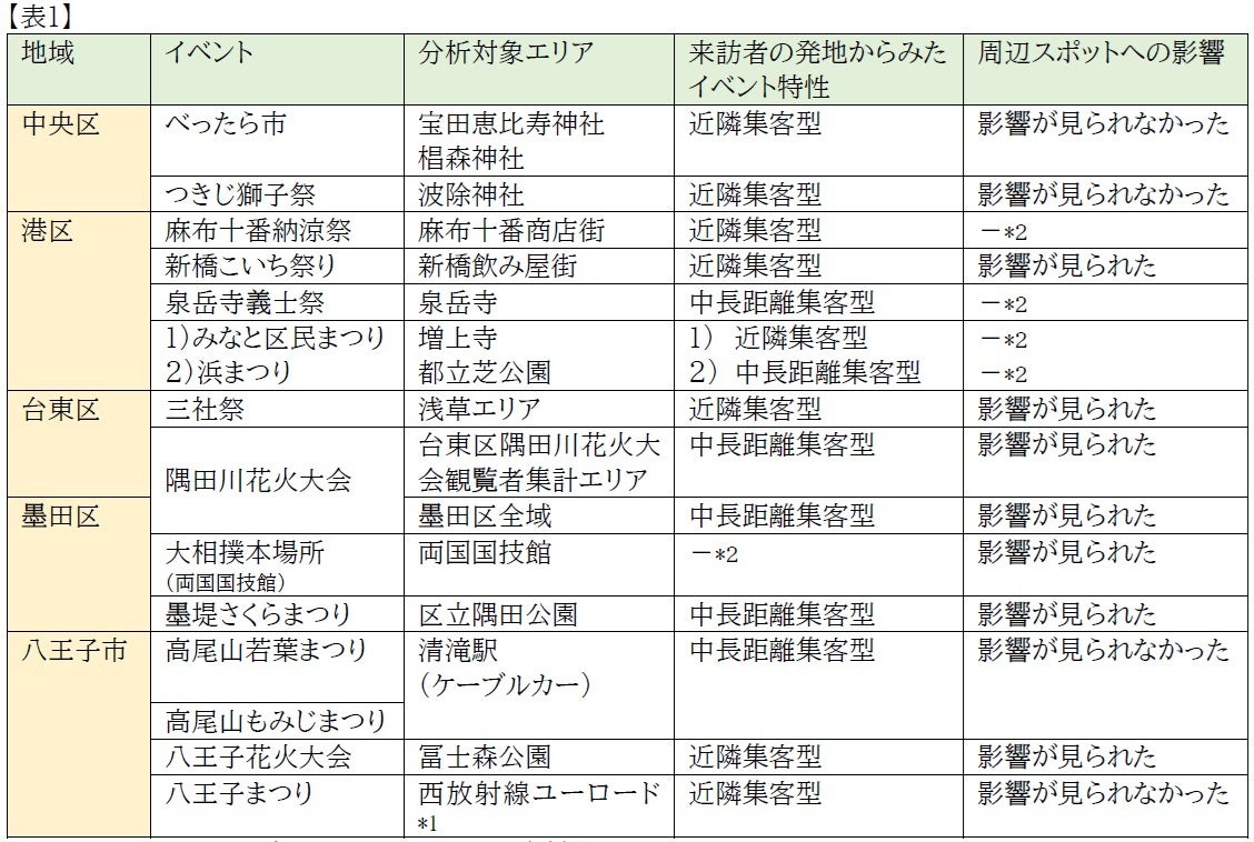 分析を試みたのは、べったら市のような地域の伝統的なお祭りから、麻布十番納涼祭、隅田川花火大会まで、様々な規模の都内15のイベントです。各イベントを視点①~④を用いて分析・考察した内容を分類すると【表1】のような結果となりました。