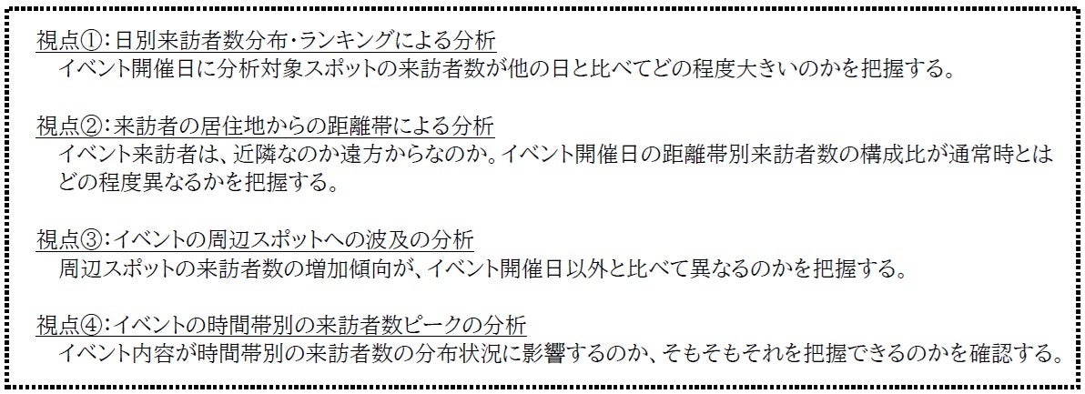 お祭り、花火大会等、イベントの定量的効果を測るために、本レポートでは4つの分析視点を用いました。