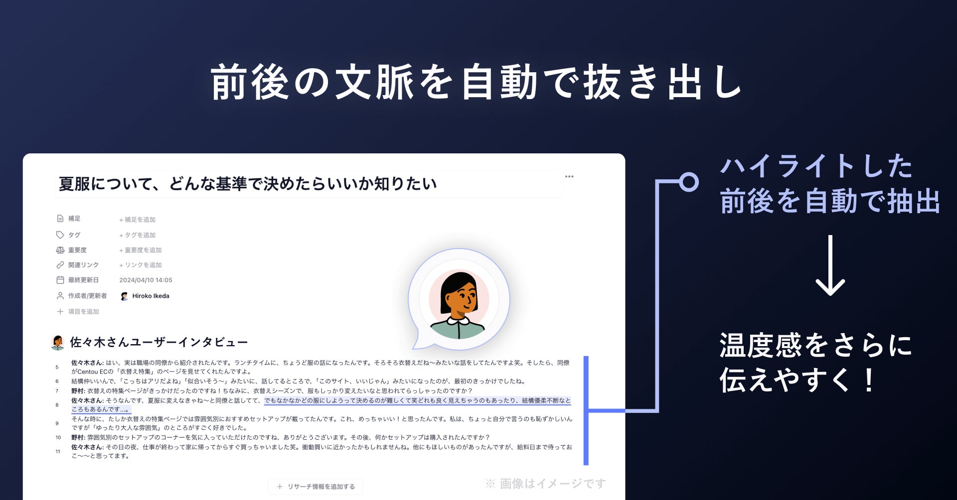 マーキング機能では、ユーザーインタビューの議事録内で、特定のハイライトした箇所を起点に前後の内容を自動で抽出することができます。