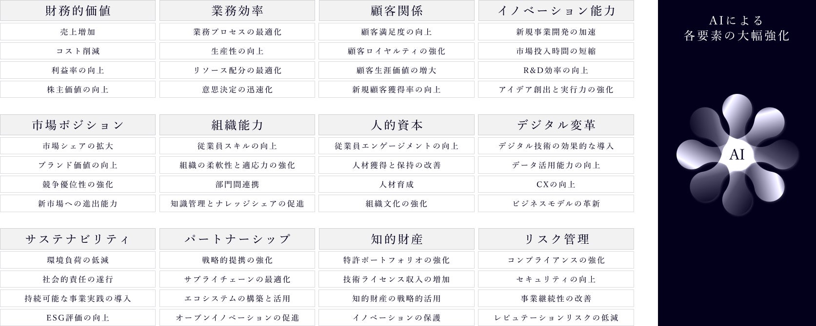 生成AIに関する多くの知見から、企業価値を高めるほぼ全ての活動において、生成AIによるエンパワーメントの余地があると考えております。特にオールドエコノミーについては生成AIによる大幅な業務効率化(DX)を実現することができます。例えば、人材業界であれば様々なフォーマットで送られてくる職務経歴書を自動的に一つのフォーマットに入れ直すことや、うまく書かれていない自己PR文章をうまく書き直したりできます。素材メーカーなどでは様々な経路(電話、FAX、メール、LINE、独自発注システム)などから発注が来て、それを人の手で発注システムに入れ直すことをしていたりしますが、それを生成AIで自動化することができます。