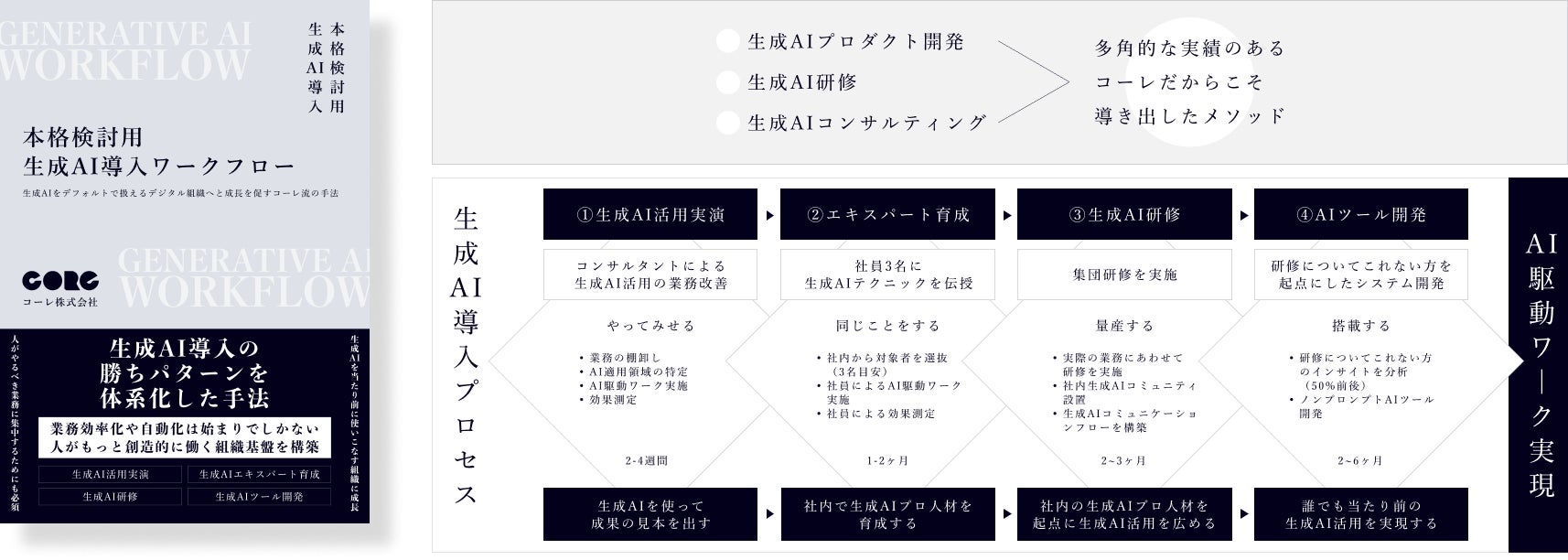 コーレは、デジタルマーケティングやデザインから始まり、事業開発代理店(新規事業支援やDX支援)としてスタートアップから大企業まで、さまざまな新規事業やDXプロジェクトに伴走してきました。そして現在、ほぼすべての対応プロジェクトが生成AI関連プロジェクトとなっており、生成AIに関しては生成AI導入、生成AI/DX研修、生成AIシステム開発と、多種多様な業界業種に対して支援をしてきました。それらの経験やノウハウを体系的にまとめ、「本格検討用生成AI導入ワークフロー」としてメソッド化して生成AIに関連する支援をしています。