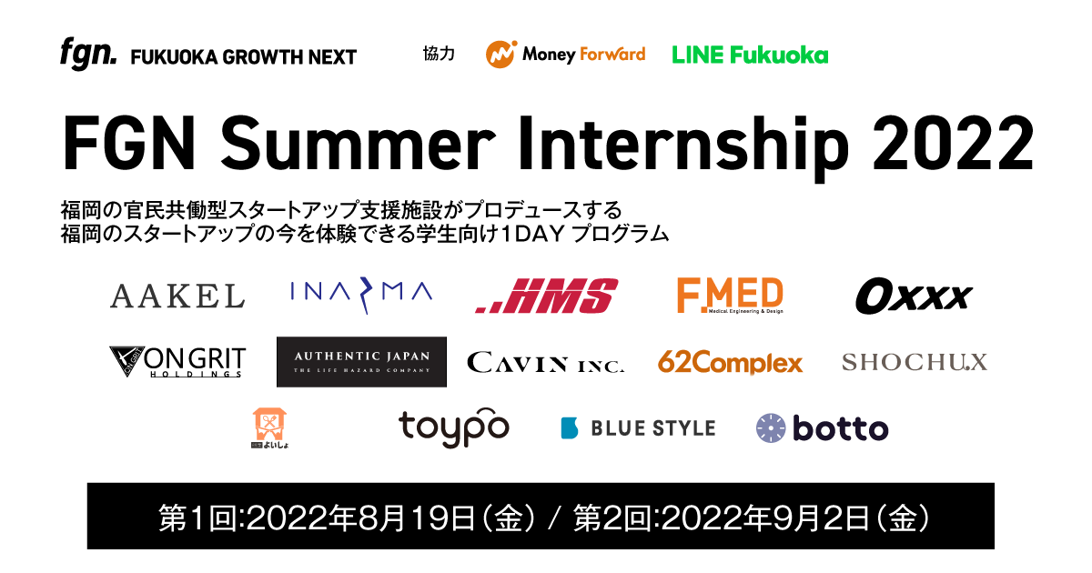 福岡市の官民共働型スタートアップ支援施設「Fukuoka Growth Next」(所在地:福岡市中央区大名、以下FGN)は、株式会社マネーフォワードとLINE Fukuoka株式会社の協力のもと、1DAYインターンシップイベント「FGN Summer Internship 2022」を8月19日(金)・9月2日(金)に開催いたします。対象はスタートアップに関心がある学生です。プログラム内ではFGNの事業説明だけでなく、インターン採用中のFGN入居企業・卒業企業によるピッチと座談会、起業プロセスを体験できるワークショップ、そして株式会社マネーフォワードとLINE Fukuoka株式会社の福岡拠点の見学を実施します。