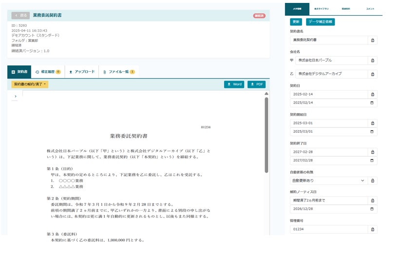 これまで自動抽出の対象としていた9項目(契約書名・会社名・契約日・契約開始日・契約終了日・自動更新の有無・解約ノーティス日・管理番号・関連契約書名)に加え、「裁判所名・関連契約日・金額・反社条項の有無」についてもAIでの抽出が可能になりました。