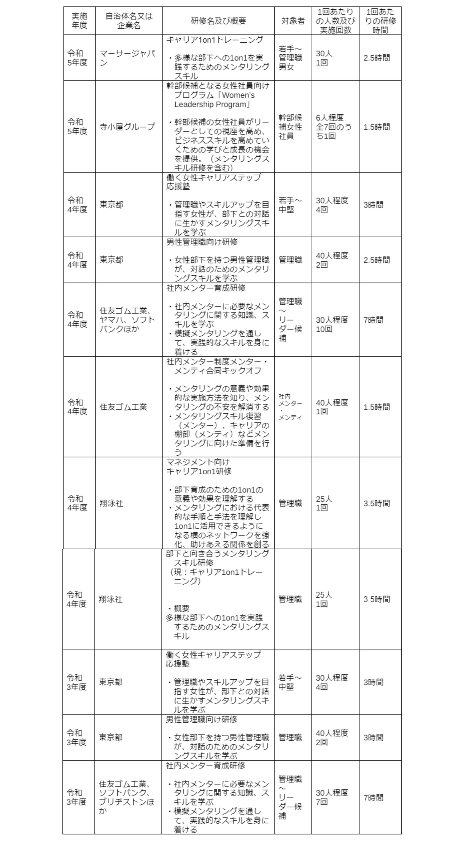 令和 4年度 | 住友ゴム工業、ヤマハ、ソフトバンクほか | 社内メンター育成研修 ・社内メンターに必要なメンタリングに関する知識、スキルを学ぶ ・模擬メンタリングを通して、実践的なスキルを身に着ける | 管理職~ リーダー候補 | 30人程度 10回 | 7時間 |
