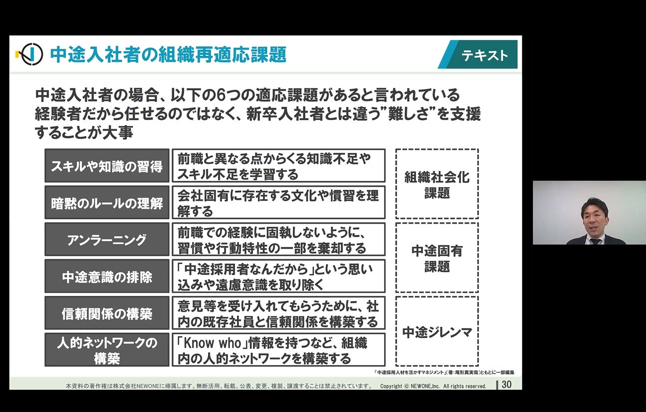 エンゲージメント向上を中心に人材育成・組織開発を提供する株式会社NEWONE(本社:東京都千代田区 代表取締役:上林周平、https://new-one.co.jp/ 以下、NEWONE)は、「中途入社者のオンボーディングを成功させるポイント(上司編)~人材流動化時代に組織力を高める方法~」を2022年3月より販売開始いたします。