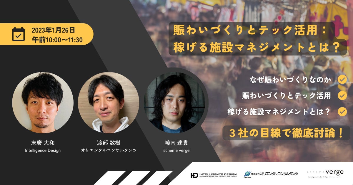 scheme verge株式会社(本社:東京都文京区、代表取締役:嶂南 達貴)は、株式会社オリエンタルコンサルタンツ(本社:東京都渋谷区、代表取締役社⻑:野崎 秀則)とIntelligence Design(本社:東京都渋谷区、代表取締役:中澤 拓二)との3社共催で、ウェビナーを開催します。当日は、各社の取り組み紹介に加えて、「賑わいづくりとテクノロジー活用:稼げる施設マネジメントとは?」のテーマをパネルディスカッション形式で実施いたします。
