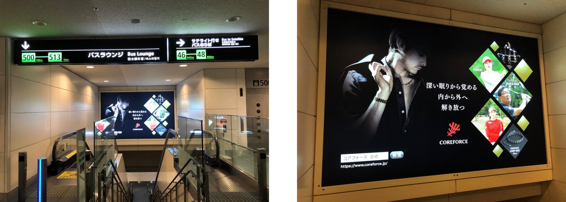 中嶋常幸プロ、古江彩佳プロ、植竹希望プロが出演 コンディショニングアクセサリー「コアフォース」 羽田空港第2ターミナルの大型電照看板に登場
