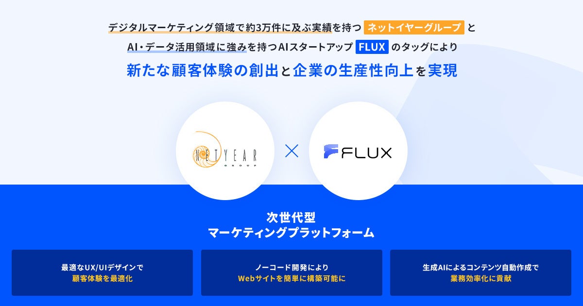 FLUXとネットイヤーグループは「次世代型マーケティングプラットフォーム」をWebサイト構築領域から開始し、デジタル社会の適合格差を解決するべく、マーケティング分野における様々なソリューション開発・提供にも取り組んでまいります。