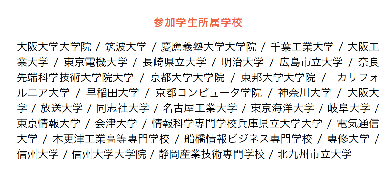 会津大学 / 愛知工業大学 / 明治大学 / 早稲田大学 / 大阪大学 / 大阪大学大学院 / 大阪工業大学 / 岐阜大学 / 京都大学大学院 / 京都コンピュータ学院 / 北九州市立大学 / 同志社大学 / 名古屋工業大学 / 千葉工業大学 / 筑波大学 / 長崎県立大学 / 木更津工業高等専門学校 / 慶應義塾大学大学院 / 広島市立大学 / 神奈川大学 / カリフォルニア大学 / 木更津工業高等専門学校 / 船橋情報ビジネス専門学校 / 信州大学 / 専修大学 / 静岡産業技術専門学校 / 東京情報大学 / 東京海洋大学 / 東京電機大学 / 東邦大学大学院 / 電気通信大学 / 奈良先端科学技術大学院大学 / 放送大学 / 情報科学専門学校兵庫県立大学大学