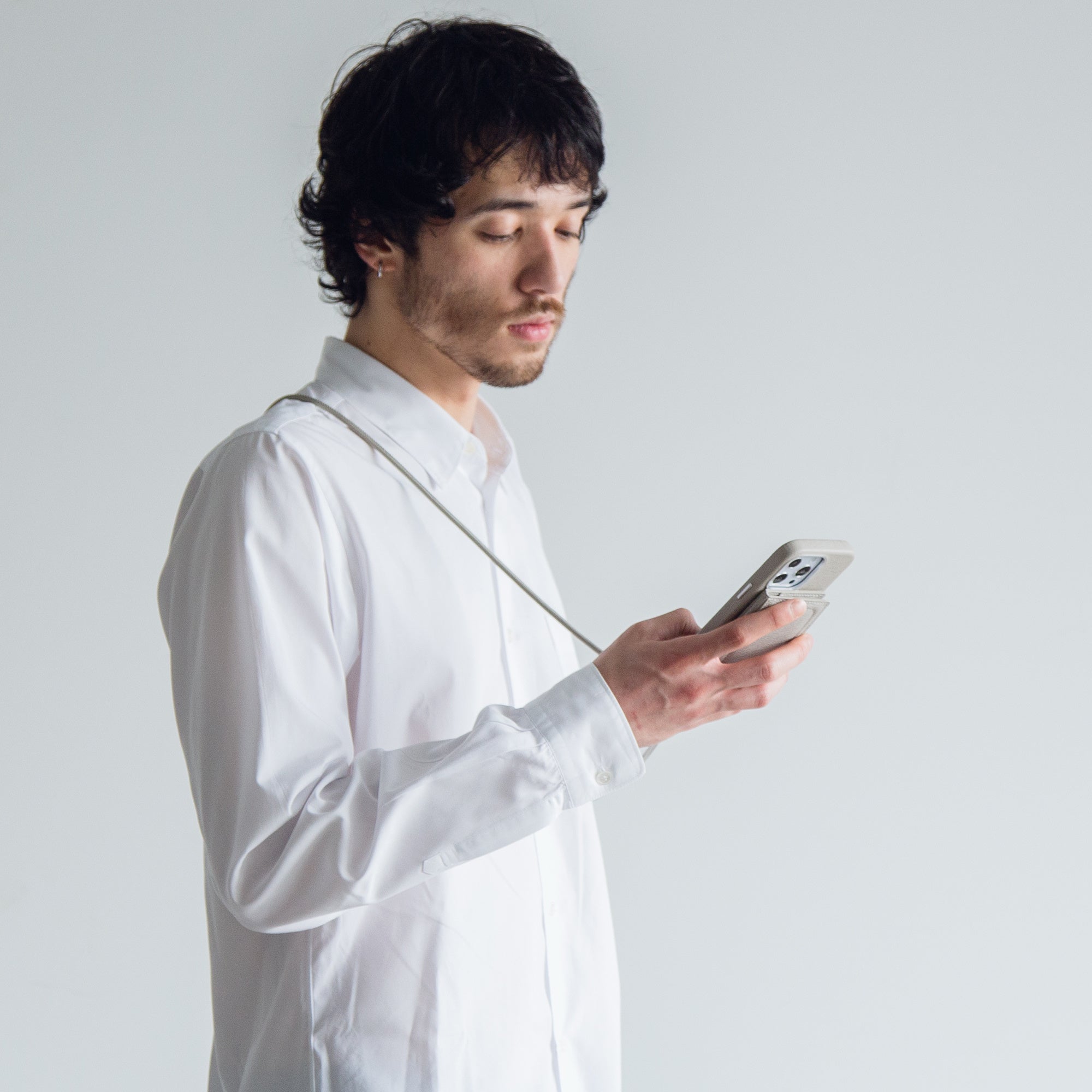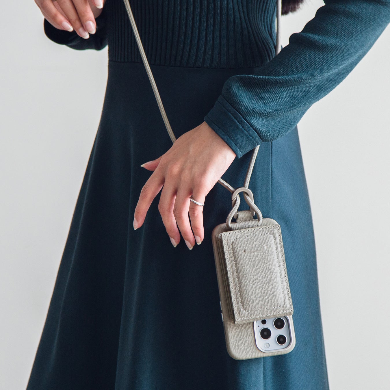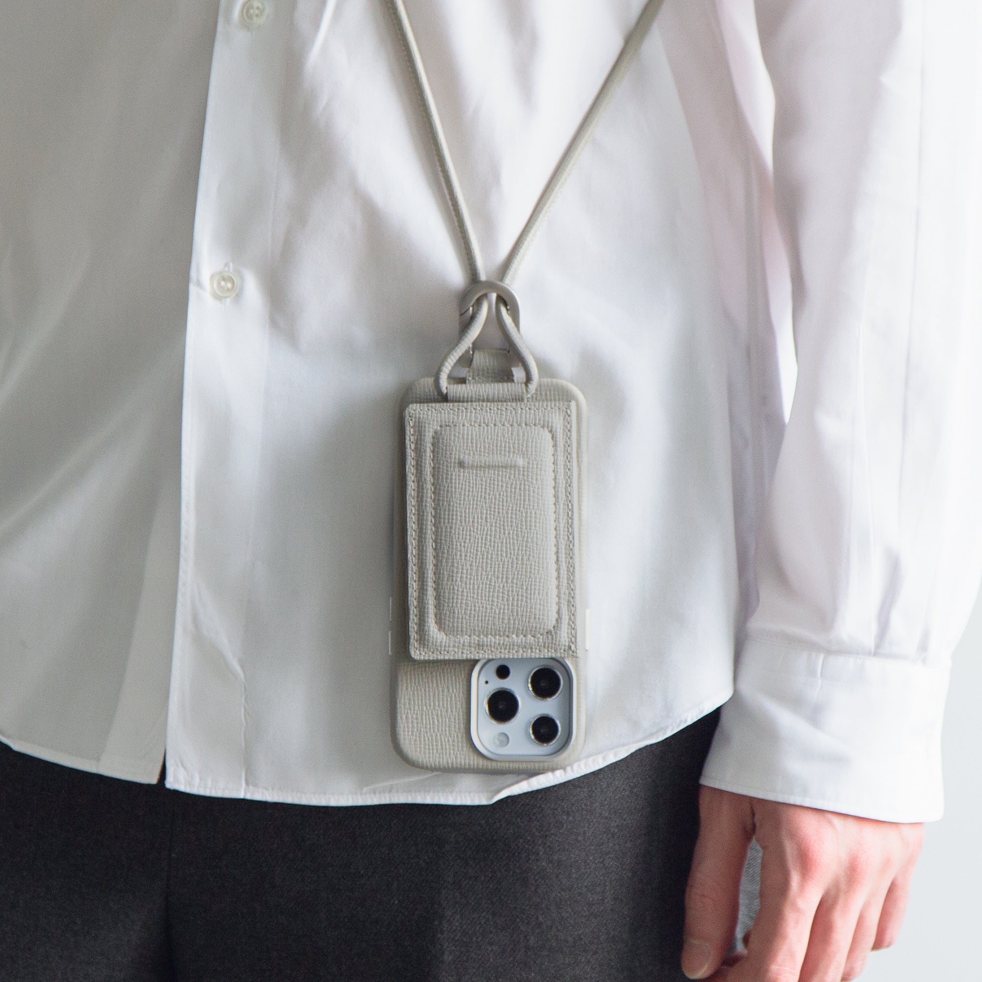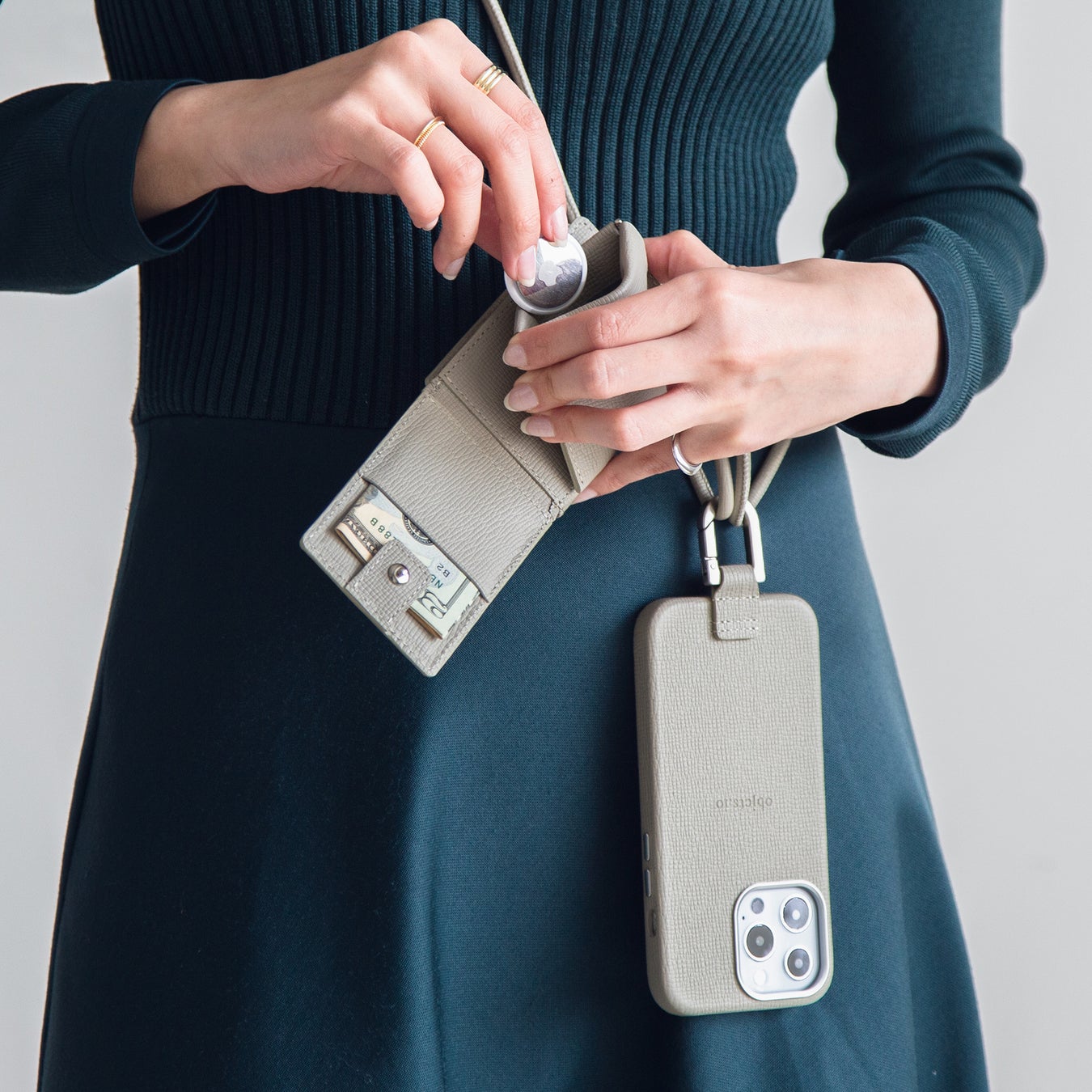 持ち歩く際は、下部に設けたカラビナにストラップを通すことで安心して身につけられます。iPhoneをポケットから出し入れすることなく、シームレスにデバイスの操作に移れるため、会計時や改札でのスムーズな決済が可能です。また、卓上に置く際などのストラップが不要な場面では取り外すなど、シーンに応じた使い分けられるデザインです。