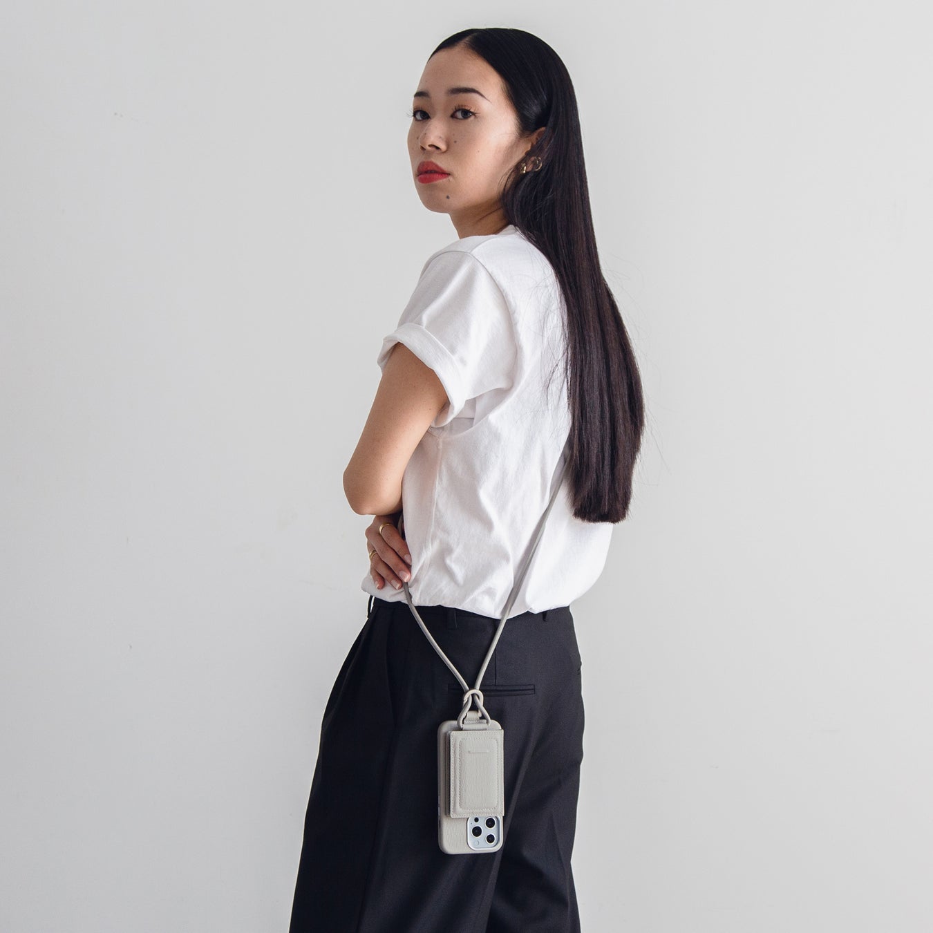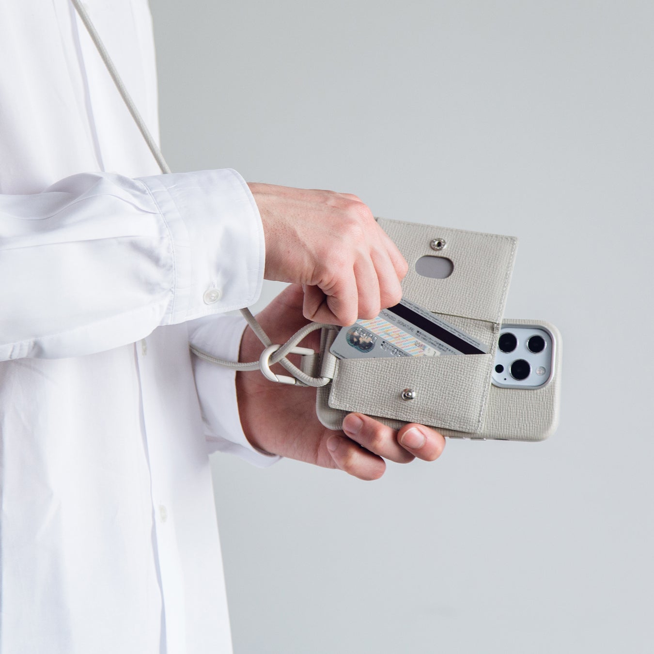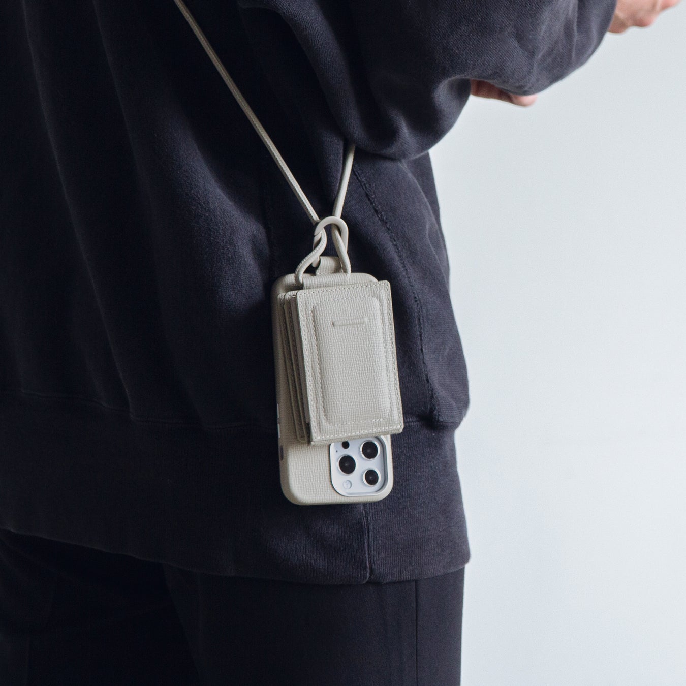 持ち歩く際は、下部に設けたカラビナにストラップを通すことで安心して身につけられます。iPhoneをポケットから出し入れすることなく、シームレスにデバイスの操作に移れるため、会計時や改札でのスムーズな決済が可能です。また、卓上に置く際などのストラップが不要な場面では取り外すなど、シーンに応じた使い分けられるデザインです。
