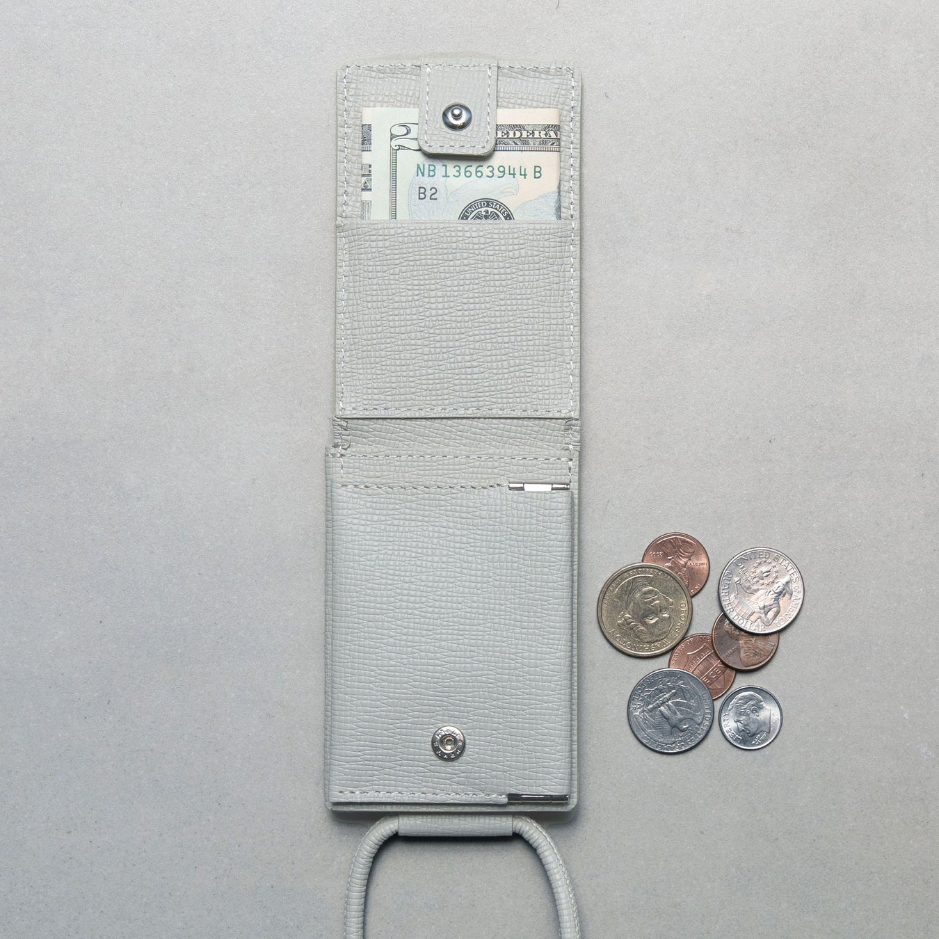 「ウォレット」は、縦と横に二重に開閉する仕様で、札入れ・コインポケット・カードポケットを備えています。三つ折りの紙幣5枚・硬貨10枚・カード2〜3枚を収納できるほか、コインポケットにはAirTagも収納可能です。
