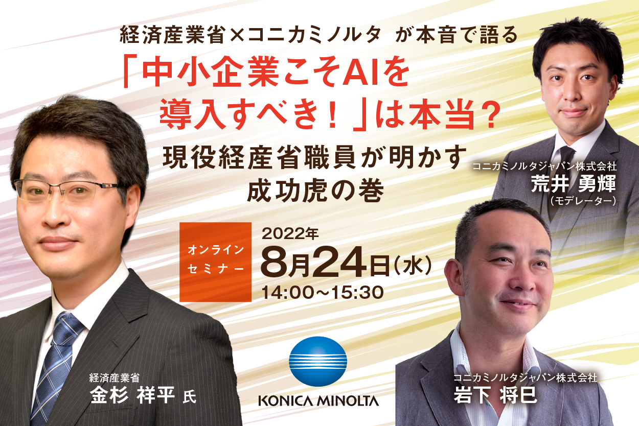 コニカミノルタジャパン株式会社は、「経済産業省×コニカミノルタが本音で語る『中小企業こそAIを導入すべき!』は本当?現役経産省職員が明かす成功虎の巻」オンラインセミナーを2022年8月24日(水)14時より開催することをお知らせします。