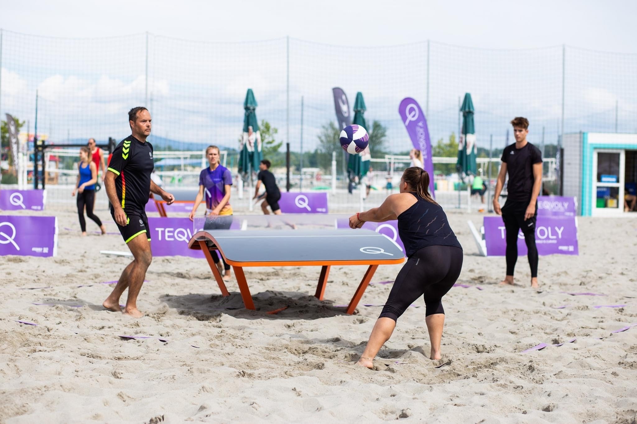 テックバレーとは、ハンガリー発祥の、バレーボールと卓球を組み合わせたような新しいスポーツです。2人対2人で対戦し、3タッチ以内で相手側のテーブルにボールを返すラリーを行う、身長の高低や男女、年齢に関わらず誰でも楽しめるメッセージ性あるバレーボールです。日本国内で本格的に行われるのは今回が初めてとなります。