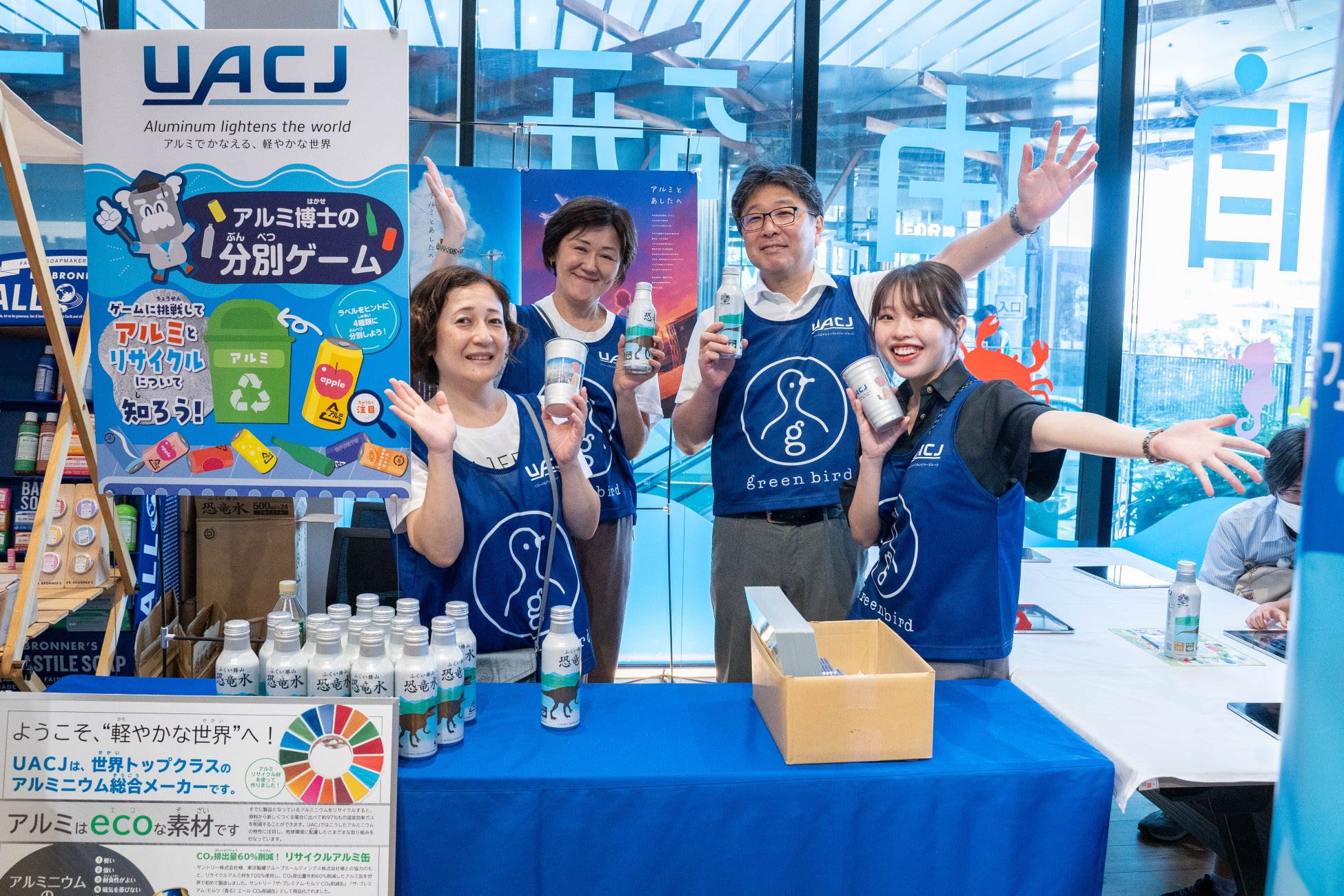 アルミ缶のリサイクルについて、楽しく学べる体験ゲームをご用意!参加者には恐竜水をプレゼント!