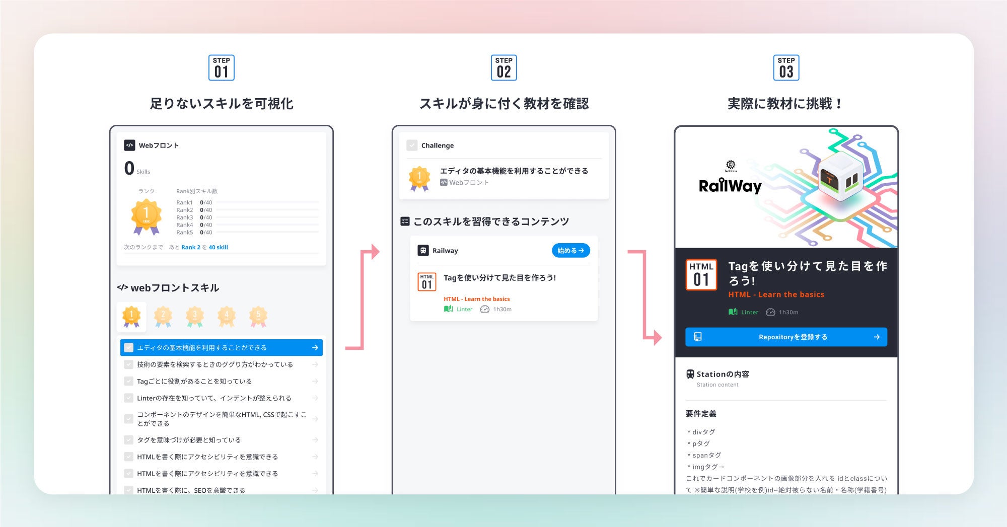 ユーザーに足りていないスキルをあぶり出し、そのスキルを習得するために取り組むべきTechTrainの教材を提供することで、ユーザーの実力を一段ずつ着実に上げていきます。