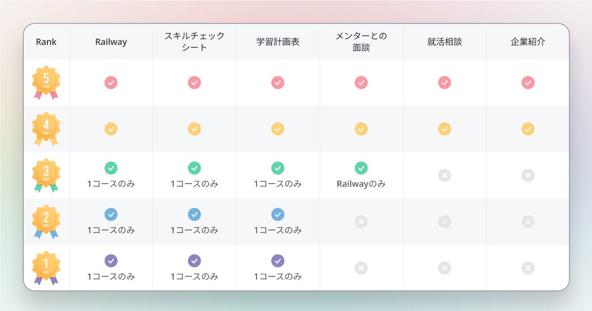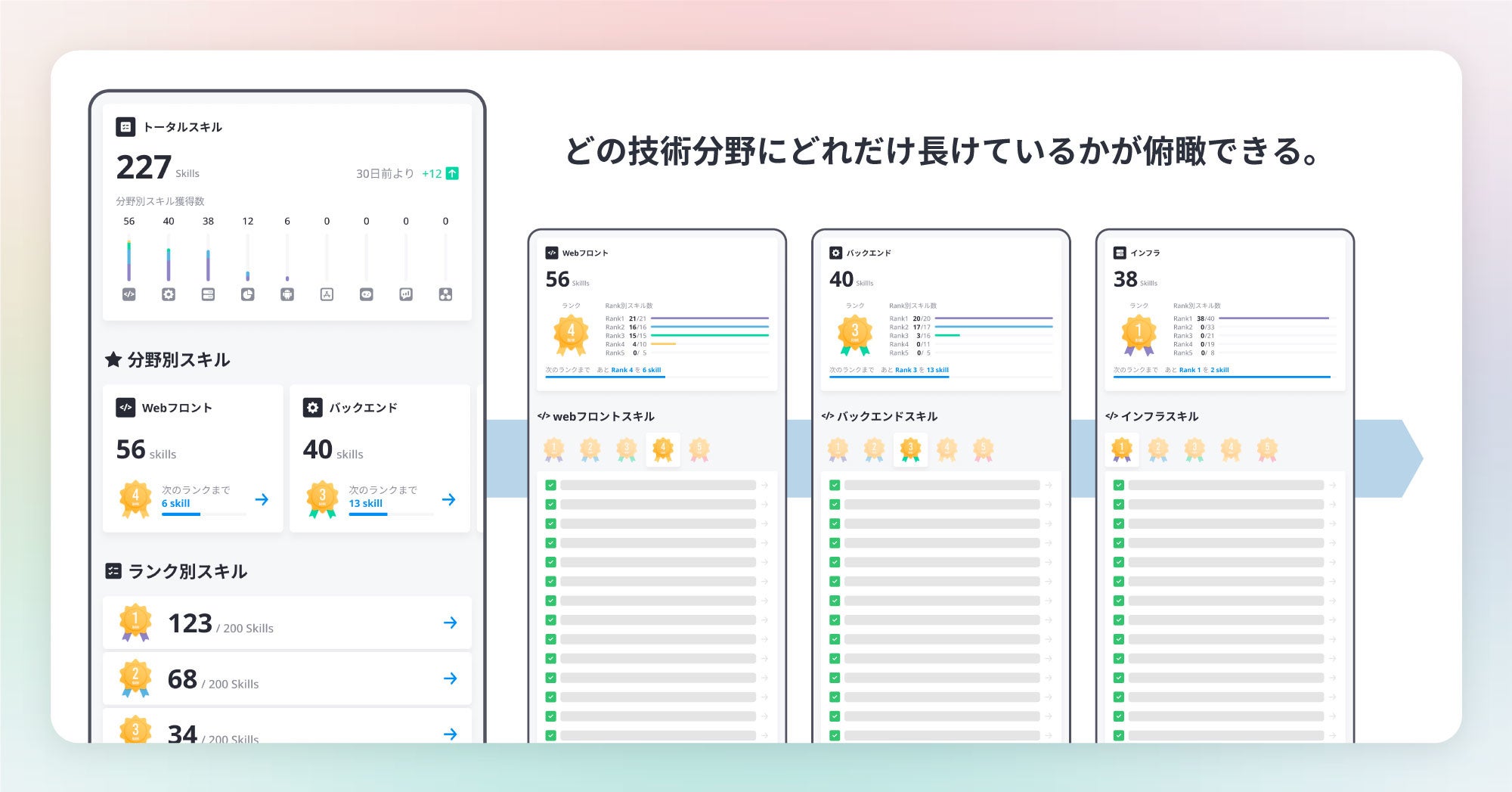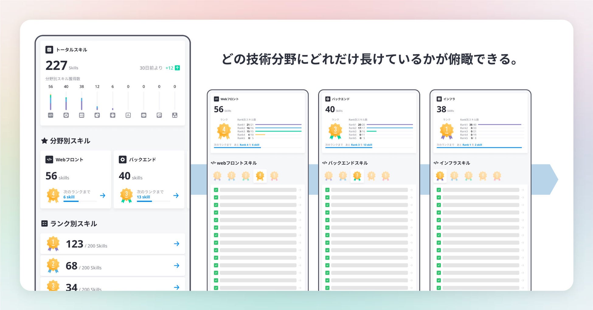 また、技術分野別にRankを設定することで、企業が求めるスキルレベルとユーザーの現状のスキルレベルを細かく比較し、ユーザーが学習すべきスキルを明確にしつつ、より精度高く企業とマッチングできるようになります。