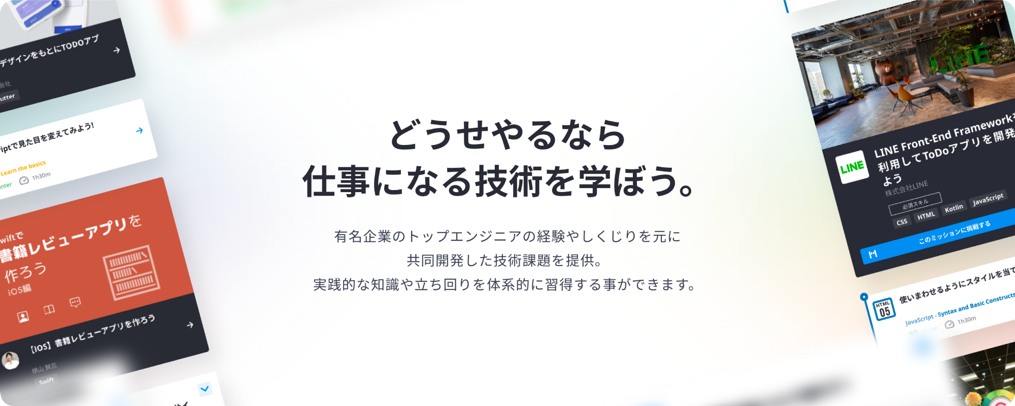 現場で必ず使う技術だけを凝縮した超実践型開発ドリル「Railway」、企業やメンターが出題する本番さながらの技術課題「MISSION」など、有名企業のトップエンジニアの経験やしくじりを元に共同開発した教材を多数提供いたしております。