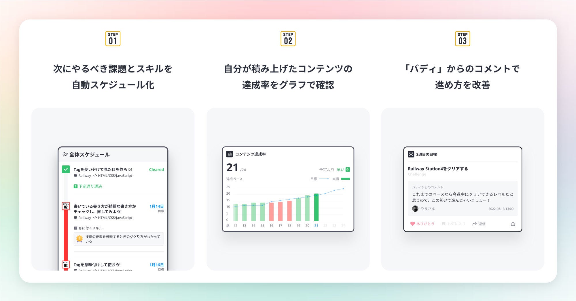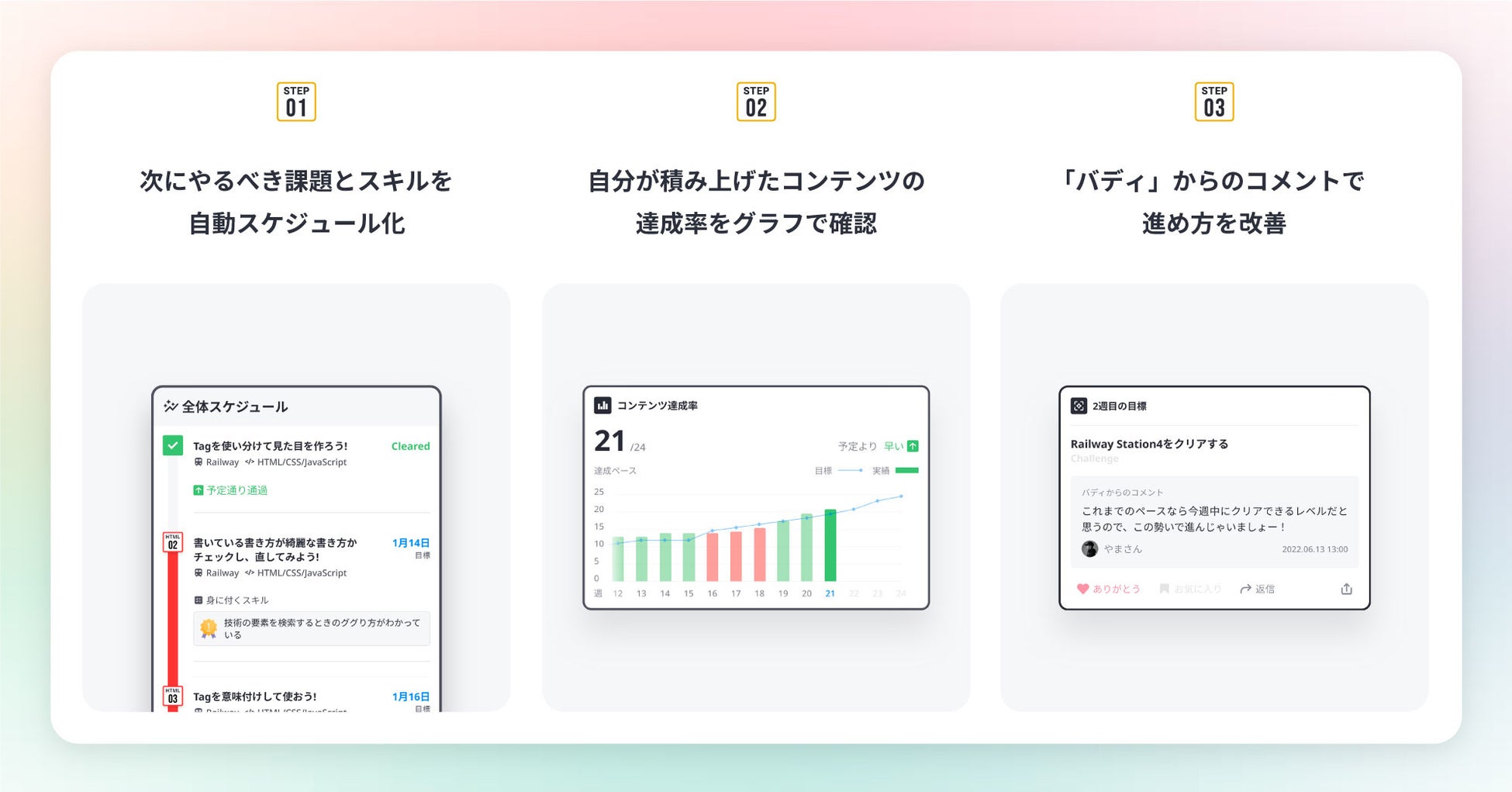 また、学習をバックアップする専属トレーナー「バディ」からエールを毎週お届けし、モチベーション維持のサポートや困った時のアドバイスも並行して行います。