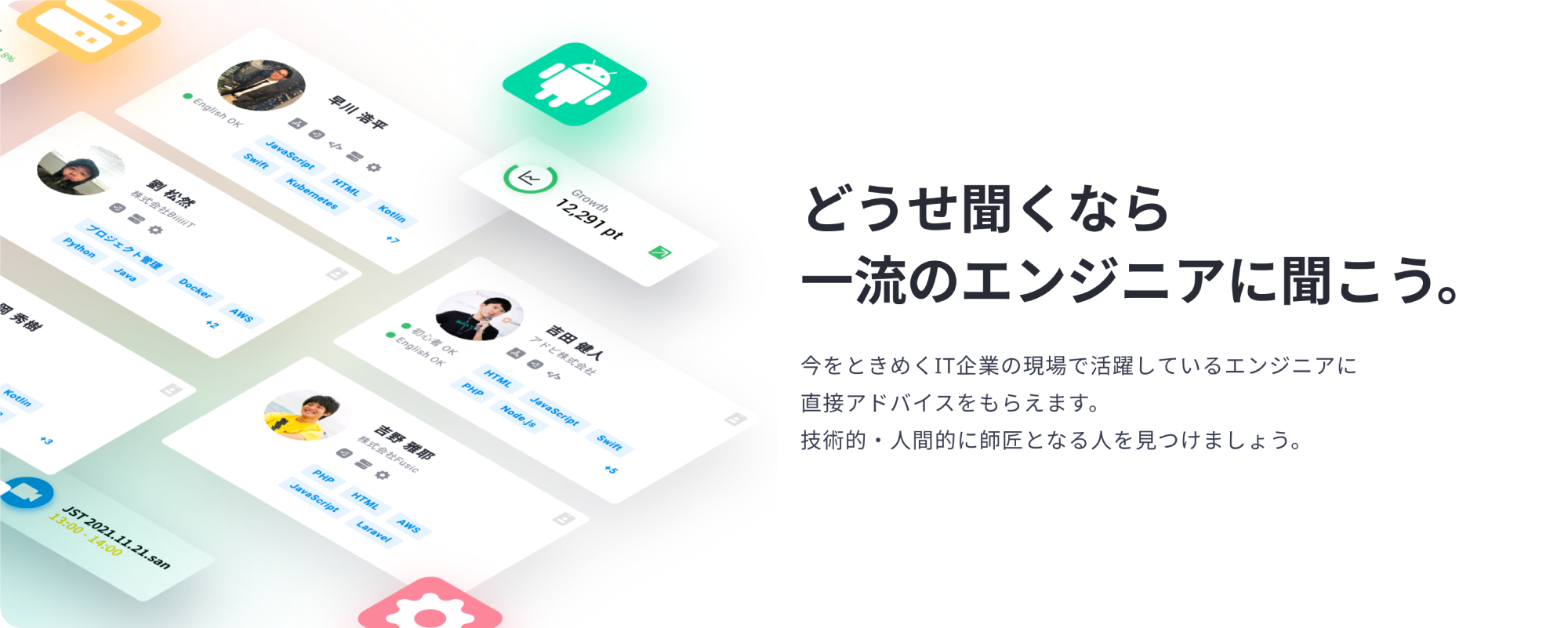 TechTrainには、公式カンファレンス登壇、有名IT企業のCTOやテックリードなど、最前線で活躍しているトップエンジニアのメンターが50社100名以上在籍しています。普段なかなか出会えないエンジニアにいつでも面談予約をすることができ、現場でしか得られない知見や一流の考え方を直々にアドバイスしてもらうことができます。
