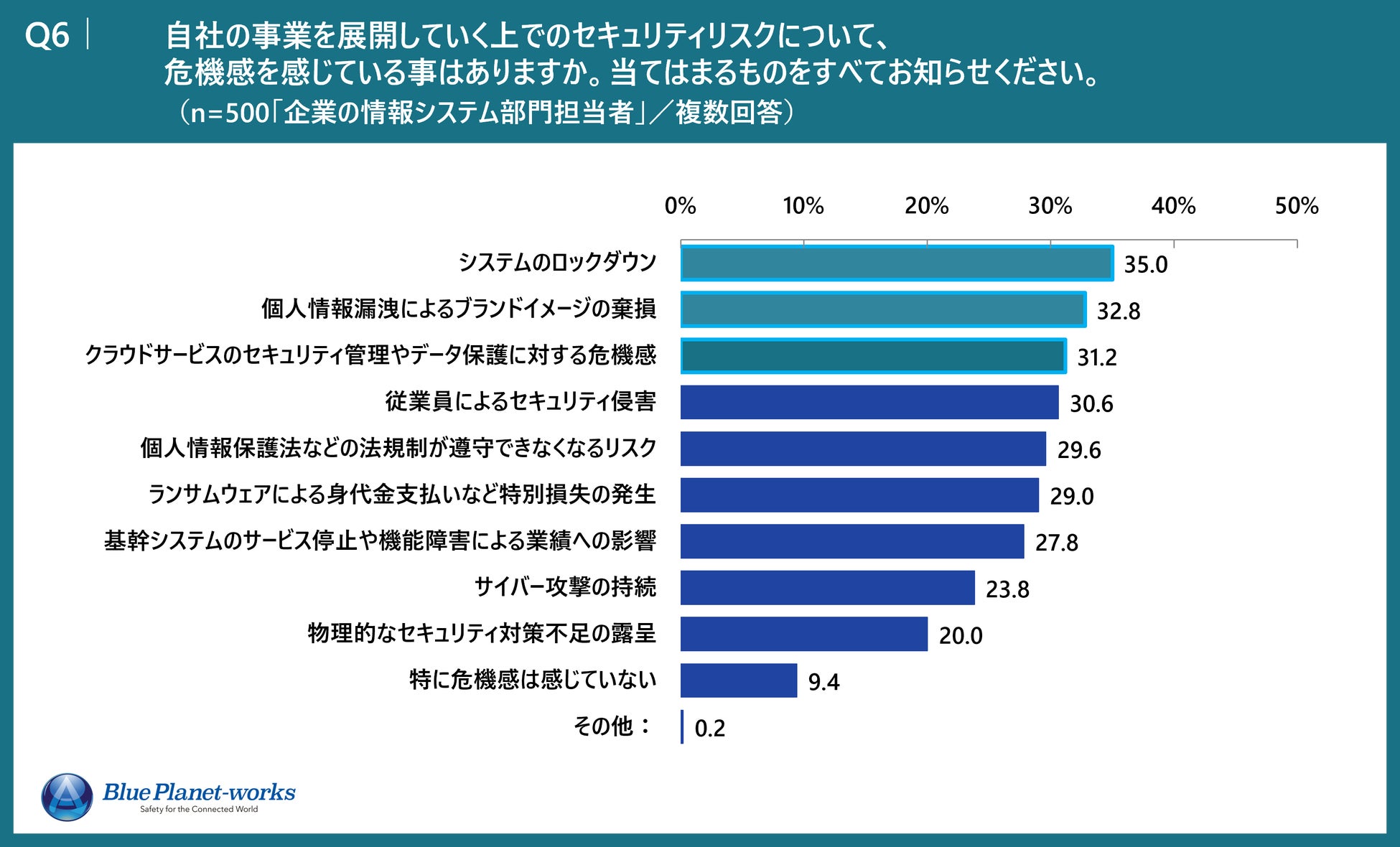 また、自社の事業を展開する上でのセキュリティリスクについて、危機感を感じているTOP3は「システムのロックダウン(35.0%)」「個人情報漏洩によるブランドイメージの棄損(32.8%)」「クラウドサービスのセキュリティ管理やデータ保護に対する危機感(31.2)」となりました。