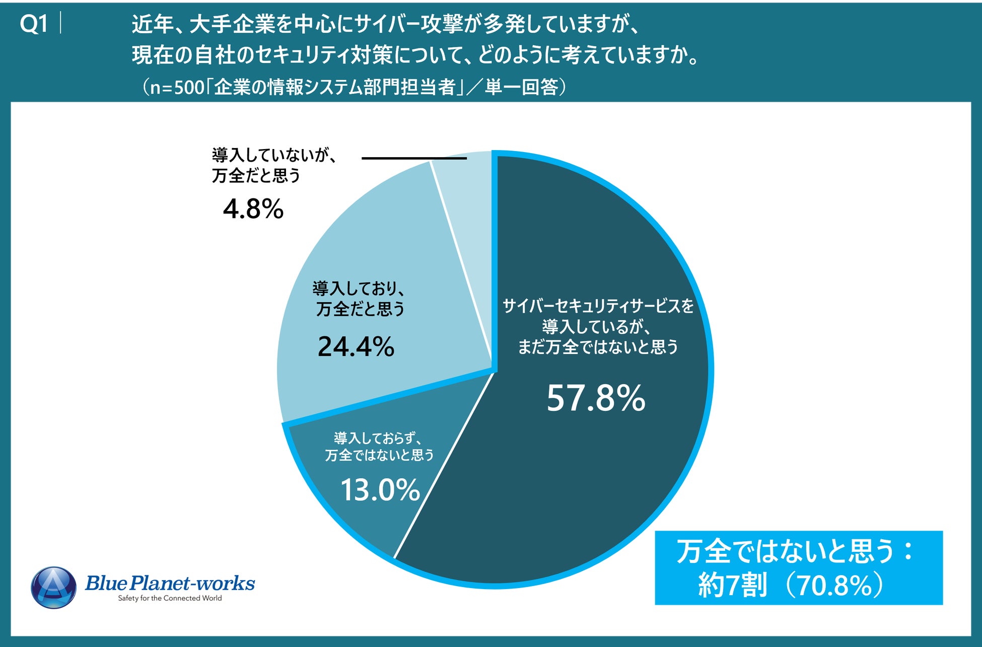 自社のセキュリティ対策に関して、70.8%の情報システム担当者が「万全ではないと思う」と回答しました。