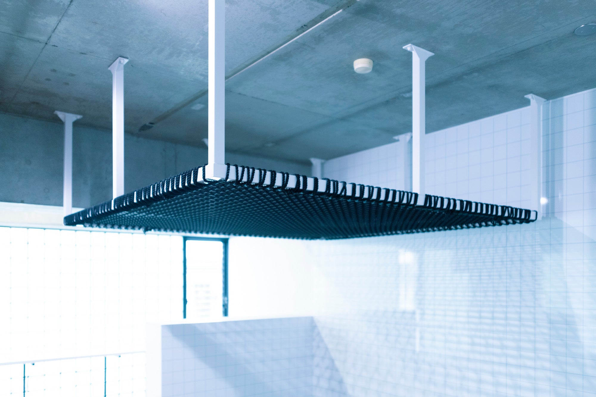 執務室付近の天井に張り巡らされているネットは、「天空ネット」と命名しました。オフィス作りに際して、社員からこういう場所が欲しいと提案がありました。デザインは、俯瞰することでよくなります。そこで、この天空の上からデザインを見て俯瞰しやすい場所を設けました。また、気持ちの切り替えをしたいとき、ハンモックに横たわる感覚でくつろぐ場所としても活用できます。弊社には「リセットタイム」という、生産性向上のため1日最大1時間の休憩を取れる制度があります。この天空で仮眠を取るメンバーも多くいます。