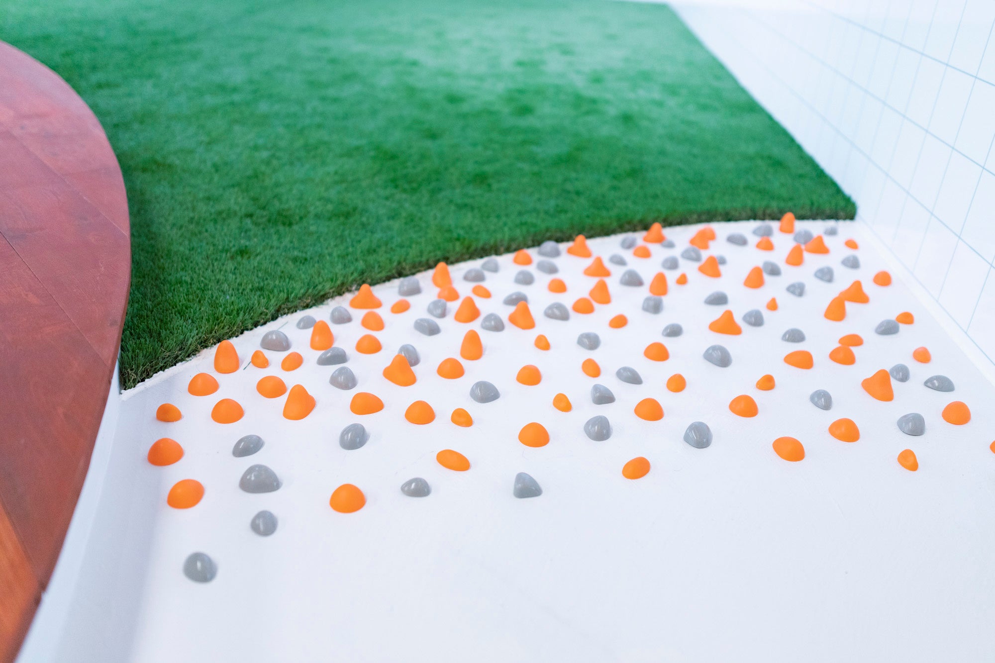 「デザインのパワースポット」をコンセプトとした、作戦会議をするジャングルジム、アイデアが湧いてくるシャワー、脳を刺激する足ツボ剣山などデザインを成長させる要素を付加したオフィスデザインに。