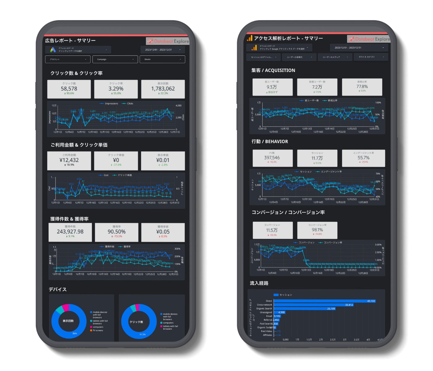 「Databeat」では、今回作成したスマホ用Google広告&GA4 Looker Studioテンプレート(ダークテーマ)」以外にも、無料でご利用いただけるLooker Studioテンプレートを多数公開しております。
