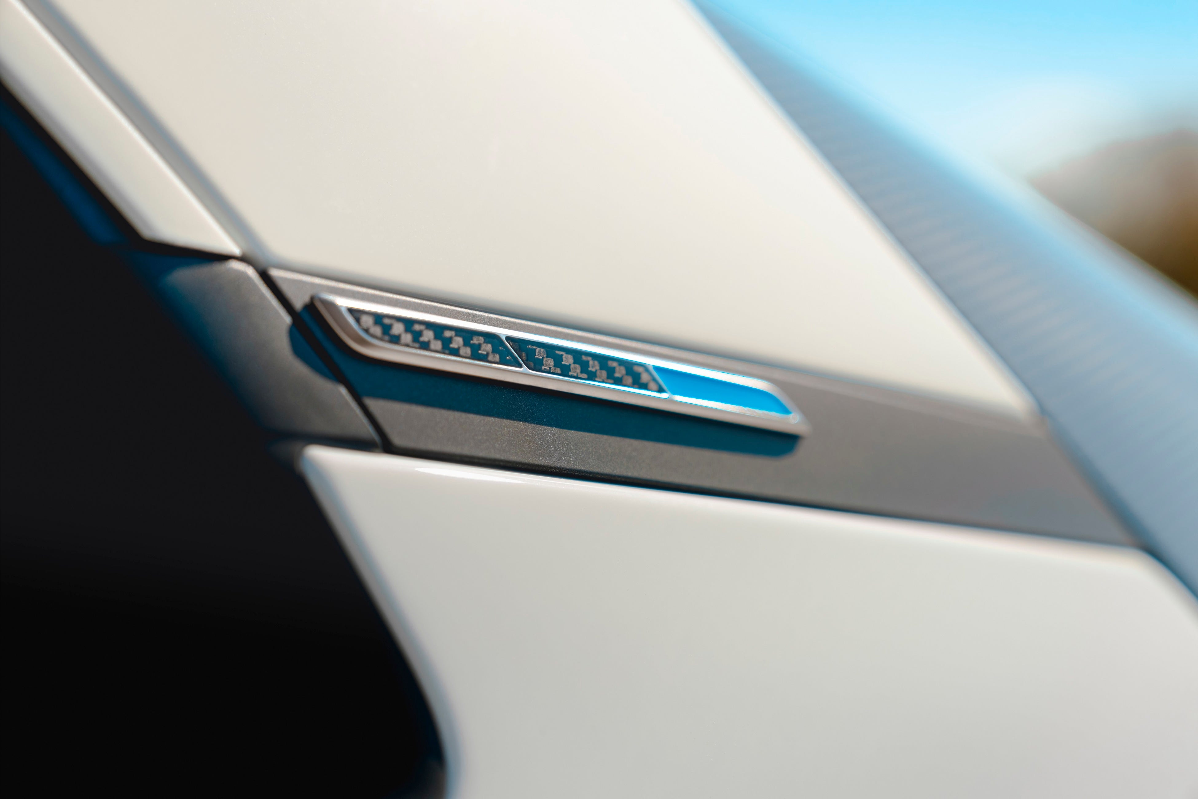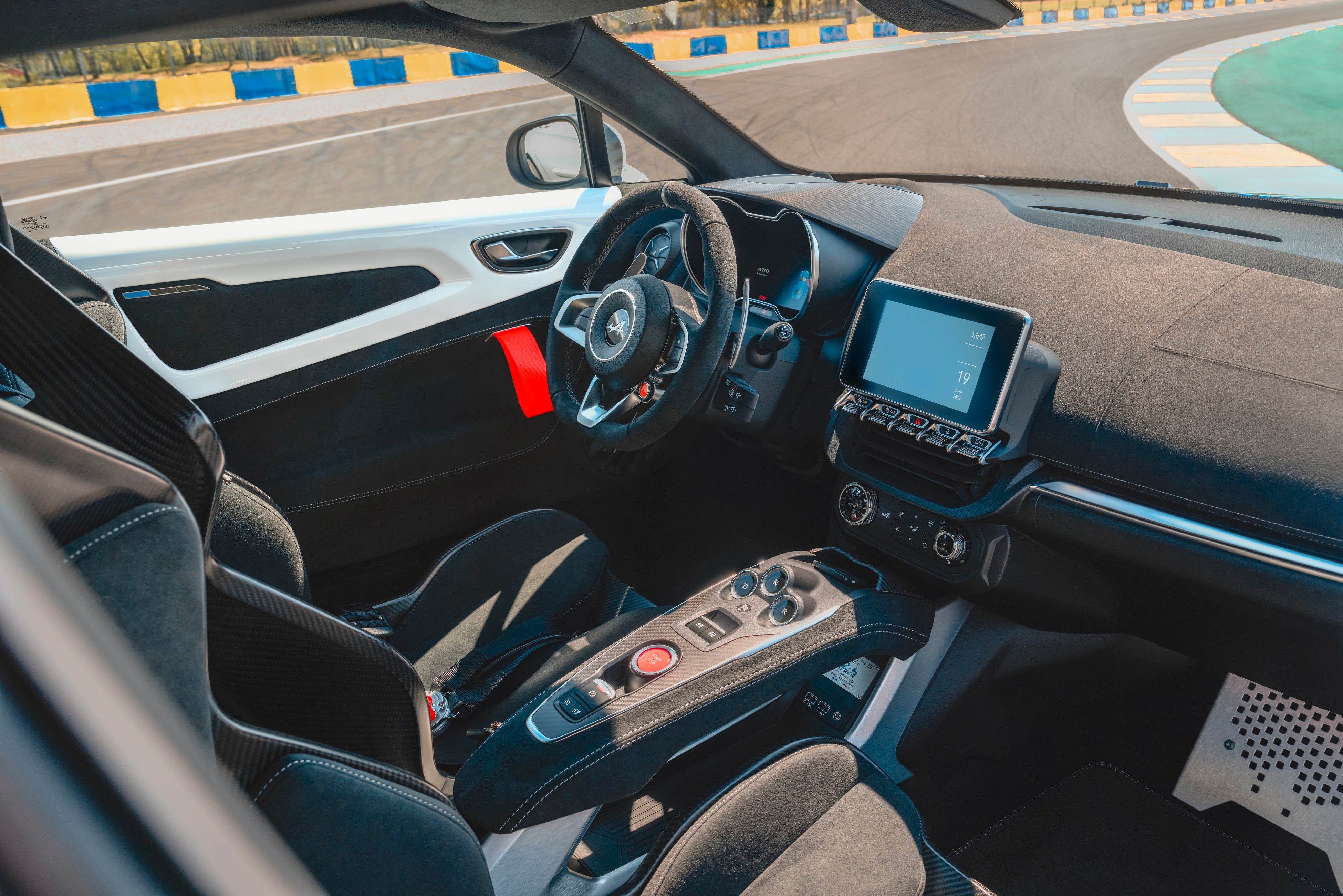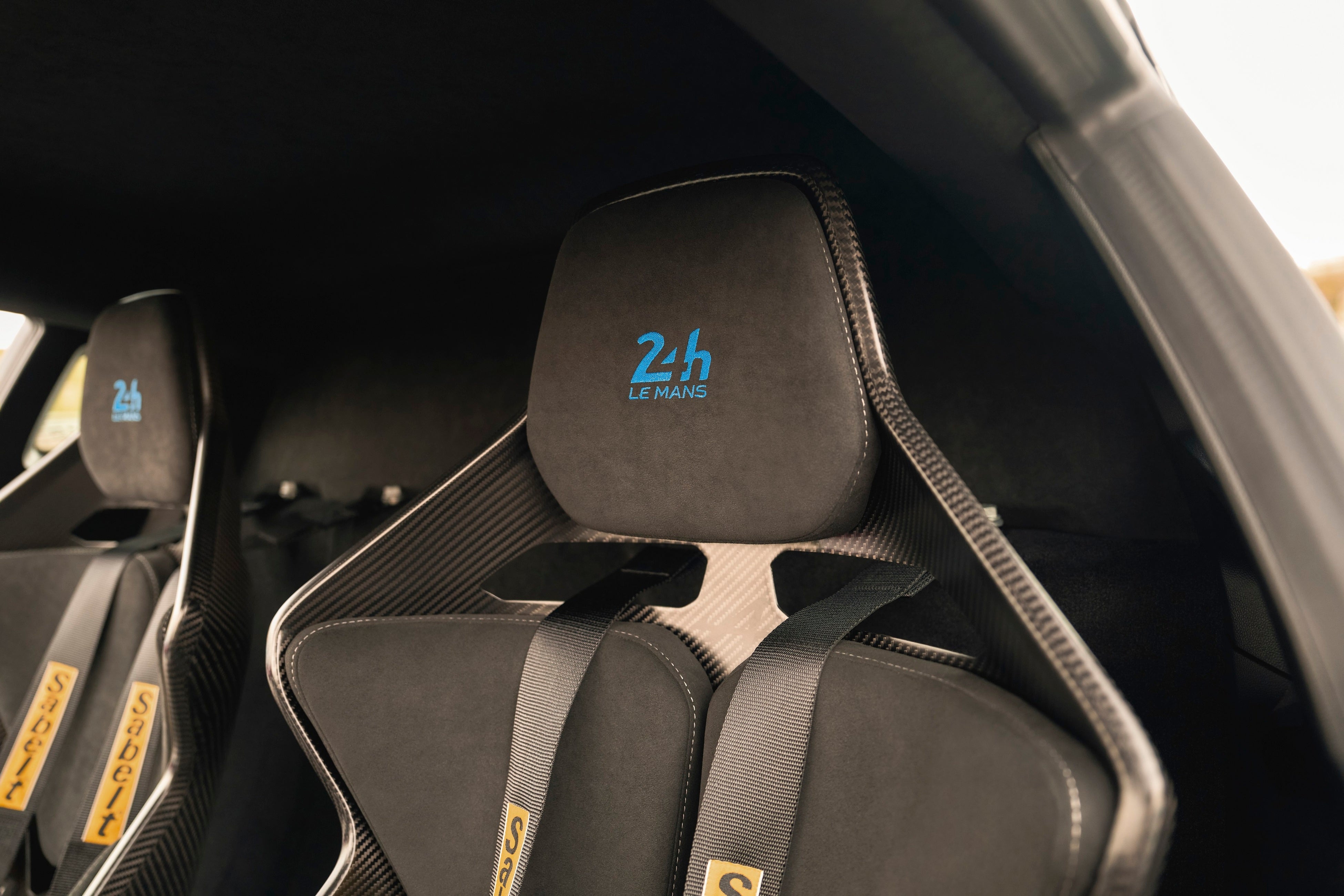 アルピーヌ A110 R ル・マンに装備される20段階減衰力調整機能付ダンパーは、アルピーヌが特許を持つRoad(標準の車高)とTrack(標準-10mmの車高・スプリング剛性5%向上)の2段階の車高調整機構(シム)を備え、高速での安定性を優先するセットアップ「ユノディエール」が施されています。また、専用デザインリアフード(シャークフィン付)、専用DUQUEINE(デュケーヌ)製18インチカーボンホイール、SABELT製フルカーボンモノコックバケットシート AEROCARBON(24H Le Mans®ロゴ付)などの専用装備に加え、内外装のデザインには、ル・マン24時間レースを象徴するブルーストライプ、ブルーロゴ、ブルーエンブレムが取り入れられています。