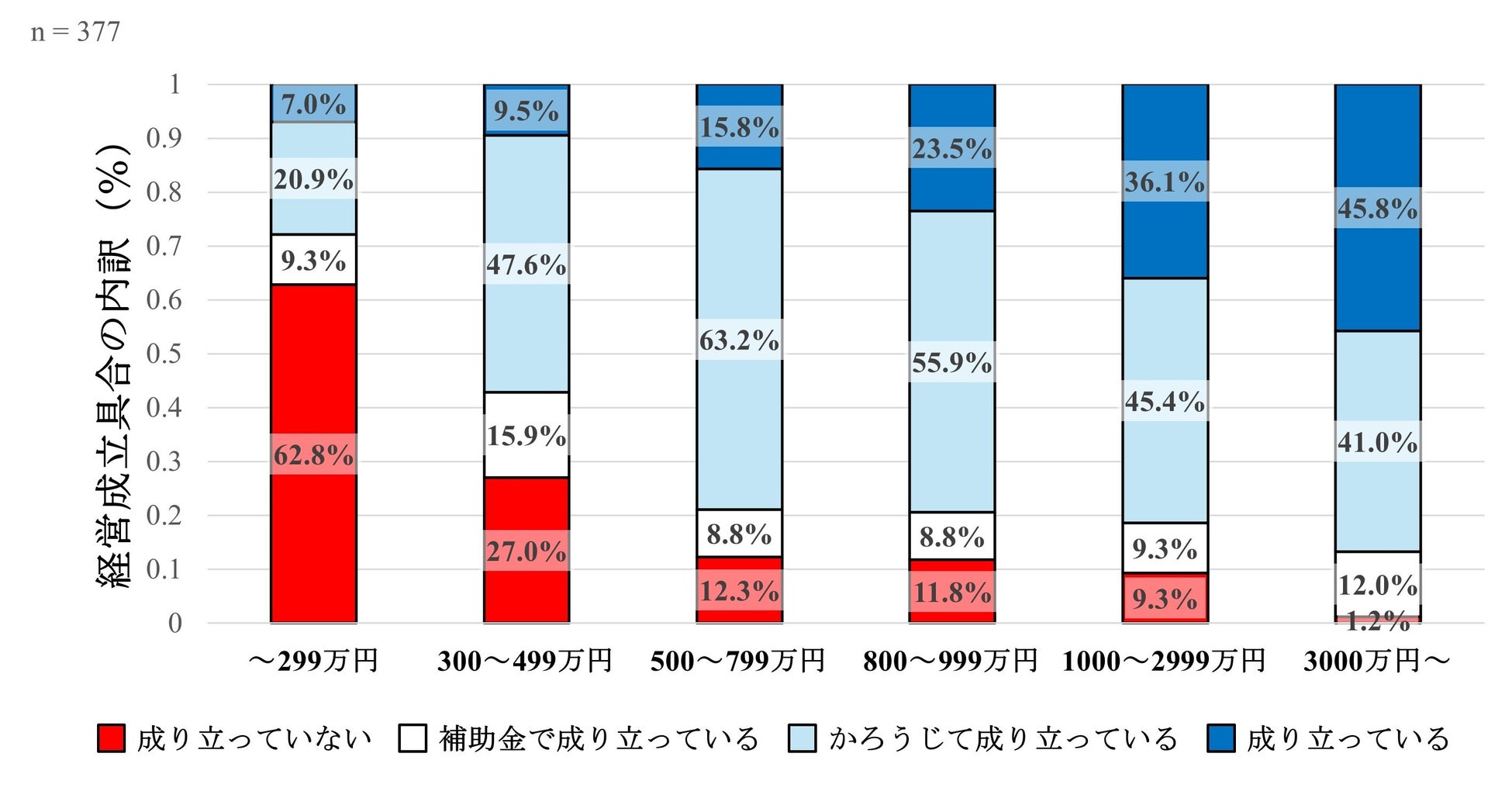 有機生産者が経営成立するための条件として「売上が500万円以上であること」が挙げられる。(図)さらに、「農業関連事業に頼るより農業自体に注力するほうが経営が成り立ちやすいこと」と「売上階級によって経営の在り方が変化すること」も明らかになった。