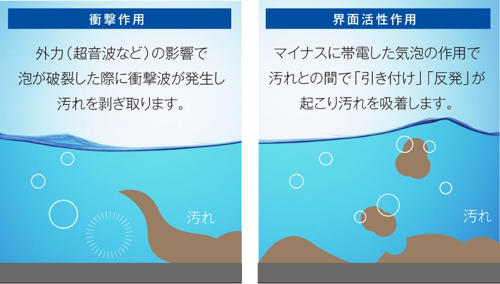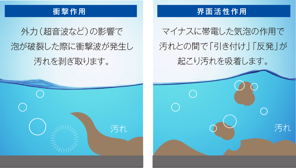 ウルトラファインバブルは、表面がマイナスに帯電しており、油分などの汚れや、プラスに帯電した物質を引き寄せやすい特性があると言われています。さらに、ウルトラファインバブルが集まり、互いにくっつくことで、固着した汚れを下から浮かせるように働きます。こうした特性によって、洗浄をサポートすることが期待されています。