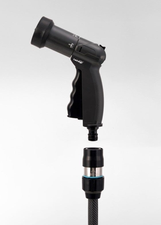 ホースを差し込み、締めるだけで装着できる独自の「ラクロック構造」を採用。工具不要で簡単に取り付けが可能です。(適合ホースサイズ:内径12~15mm、外径21mmまで)