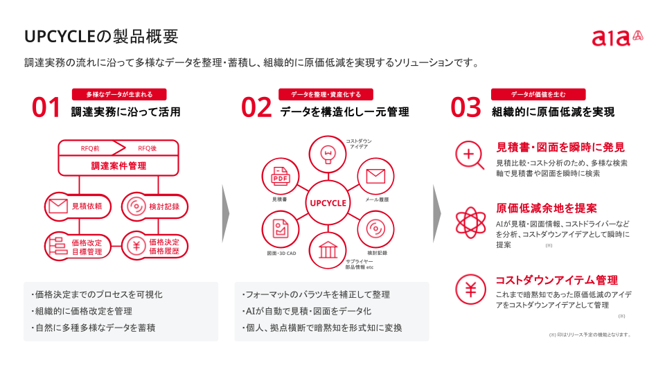 A1Aは、これらの課題を解決するため、自動車製造業向け調達データプラットフォーム「UPCYCLE」を2024年7月にリリースしました。UPCYCLEは、これまで組織的に集約・活用できていなかった見積書・図面情報、サプライヤーとのやり取りや、コストダウンアイデアなどの暗黙知を構造化データとして一元化。さらに、量産前後の調達実務をフロー化することで、データが自然に蓄積・活用される仕組みを提供してきました。