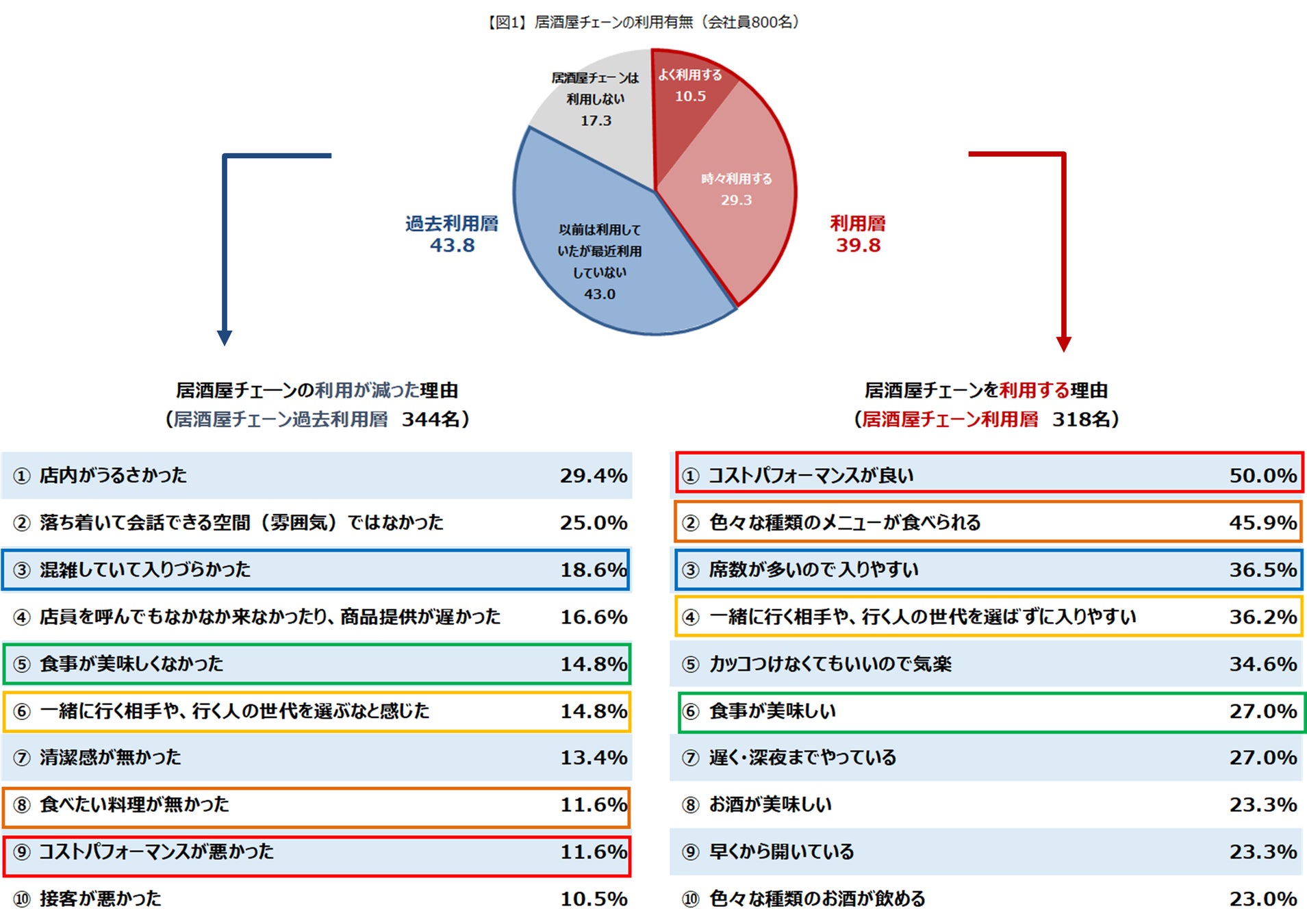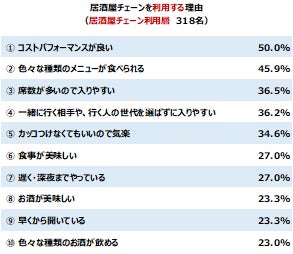 一方、利用する理由は「コスパが良い」「色々食べられる」「席数が多い」「相手を選ばず入りやすい」「食事が美味しい」等が上位にあがり、足が遠のいている人との認識にギャップが見られる。
