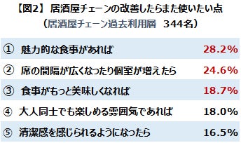 2.過去利用層が改善を希望するポイントは、「魅力的な食事」が1位。今の居酒屋チェーン現場では食事へのこだわりも。