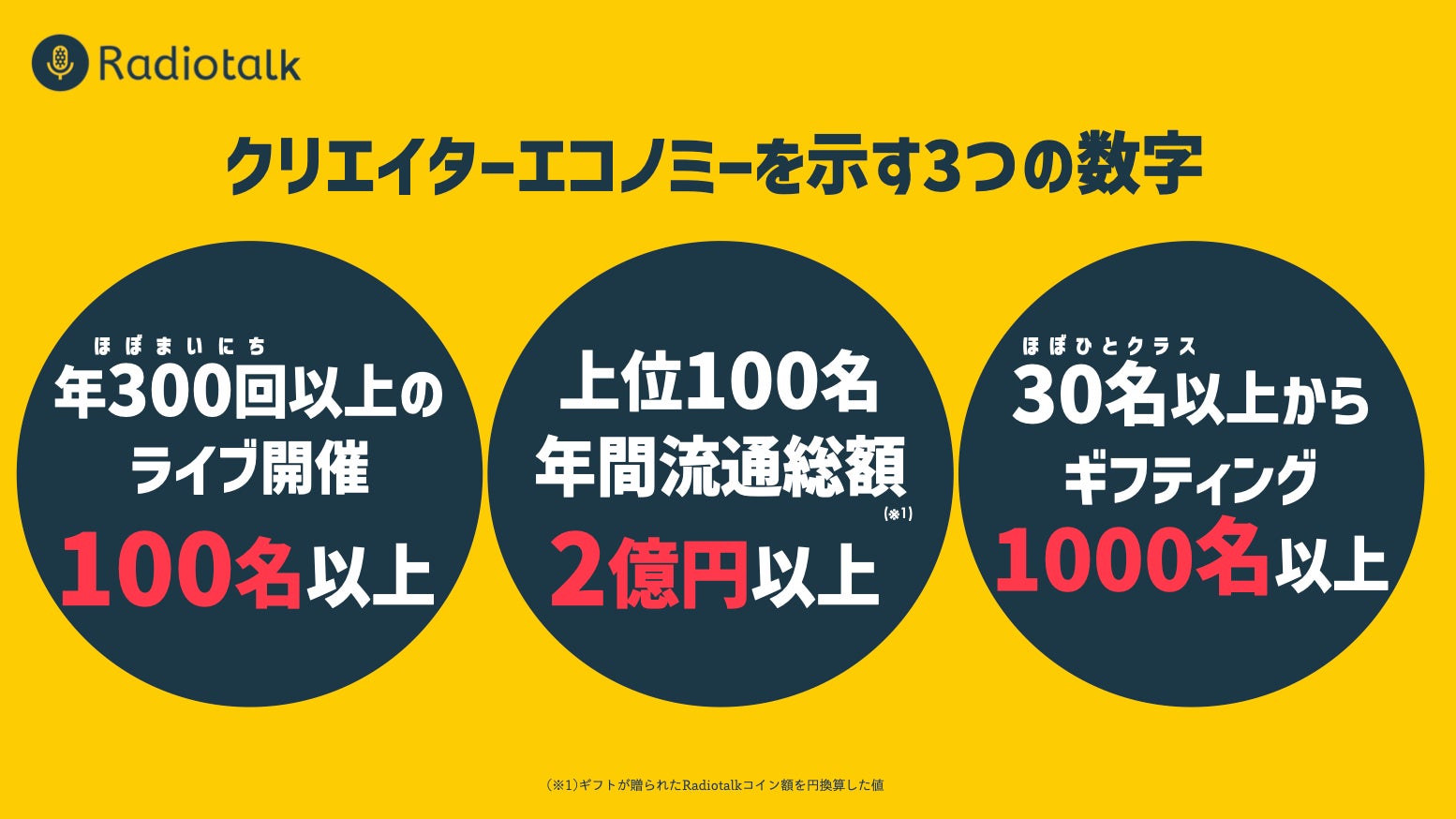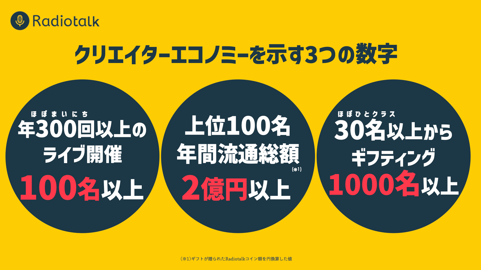 さらに、この一年でRadiotalkの特長を強固とした点は、着実に収益化に繋がる配信者を生み出せている点です。上位100名だけでも流通総額は年間2億円を超え、元サラリーマンから芸人など、Radiotalkで得られた収益を主軸として生計を立てる配信者が複数名生まれています。経済的に成長する仕組みがついてくることは、エンターテインメントの拡大に必要不可欠であると考えています。