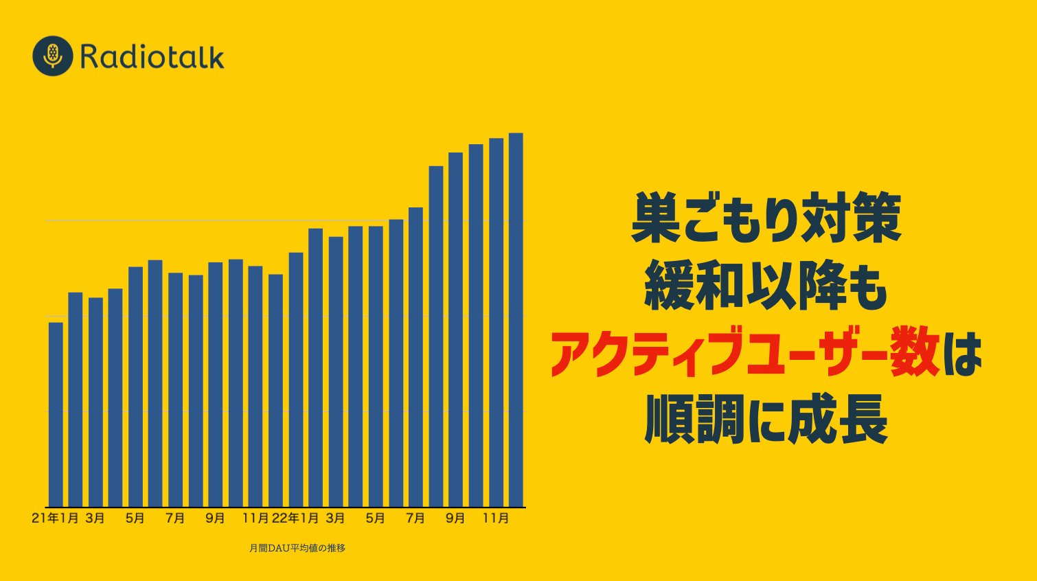 Radiotalkを含む国内の配信関連サービスは、2020年4月頃から巣ごもりの影響により成長が加速しました。その後、外出自粛の感染対策が緩和された以降も、Radiotalkではユーザー数が引き続き定着し、特に「毎日起動する」ことが習慣化したユーザー層が拡大しています。これはRadiotalkが、コロナ特需の配信ツールにとどまらず、アフターコロナに向けたコミュニケーションのDXとして、日常を支える「空間」の1つとなった象徴だと考えています。