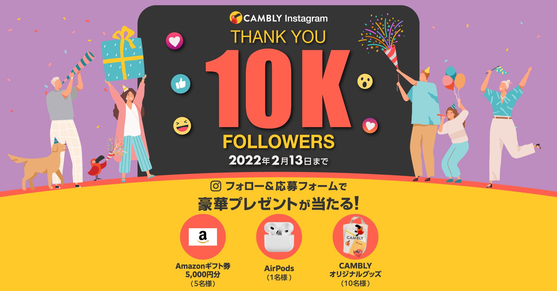 また、レッスンの場以外でも楽しく英語に触れられるよう、Camblyの公式SNSアカウントを通して英語学習に役立つコンテンツの発信を続けてまいりました。この度、そんなCamblyの公式Instagramフォロワー数が1万人を突破!皆さまへの感謝の気持ちを込めて、AirpodsやAmazonギフト券など豪華な賞品が当たるプレゼントキャンペーンを開催いたします。応募方法は、Instagramでのフォロー&応募フォームからのエントリーの簡単2ステップ!ぜひふるってご応募ください。