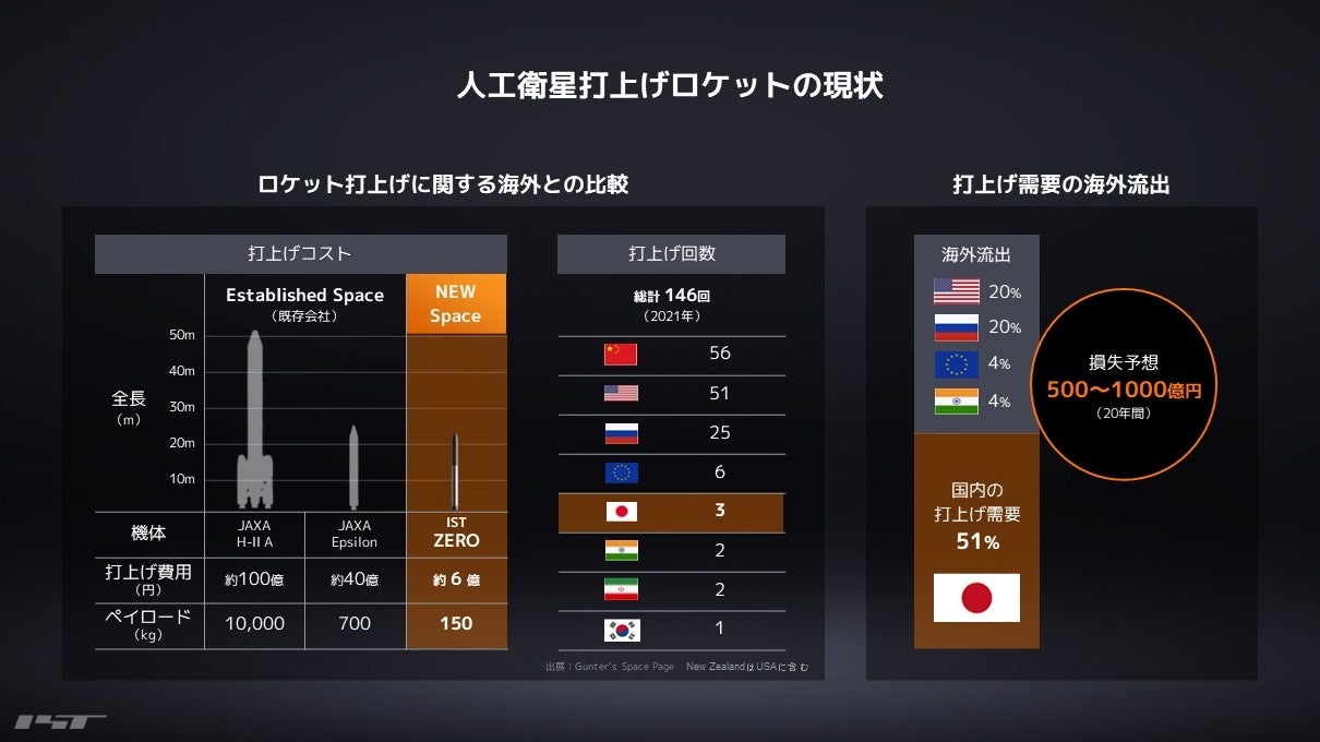 世界の宇宙市場は年々拡大しており、2040年には今の3倍近くとなる110兆円の巨大市場に成長すると予測されています(*1)。特に小型サイズの人工衛星の需要が大きく伸びており、衛星を使ったインターネット通信の普及、衛星データを活用した「超スマート社会」の実現など、幅広い分野への波及効果が期待されています。一方、急拡大するニーズに対し、衛星を運ぶための唯一の手段となるロケットは、国内の打上げ回数が年数回と世界シェアの約2%(*2)にとどまっており、国内の衛星打上げ需要は海外に流出しているのが現状です。さらに、ウクライナ戦争の影響で世界の宇宙輸送の約2割を占めていたロシアのロケットを日本や欧米諸国は使えなくなるなど、宇宙輸送能力不足が宇宙利用拡大の世界的なボトルネックとなっています。経済安全保障の観点からも各国とも宇宙輸送の強化が急務となっており、日本では2022年6月に閣議決定された「経済財政運営と改革の基本方針2022(骨太方針2022)」でロケット打上げ能力を強化する方針が示されました。また、2022年12月23日の宇宙開発戦略本部「宇宙基本計画工程表改定」では、スタートアップによる研究開発を促すSBIR(Small Business Innovation Research)制度の活用や政府によるサービス調達等によりベンチャー企業の取り組みを促進することで、宇宙を推進力とする経済成長とイノベーションを実現することも明記されました。