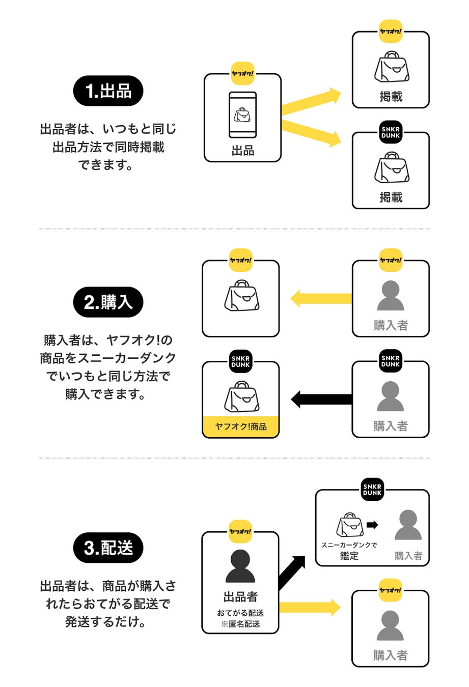 今回の連携により、出品者は、通常どおりの「ヤフオク!」への出品で「スニーカーダンク」へも商品を掲載できるため、特別の手続きなく販路を拡充させ、出品した商品をより多くのユーザーに見つけてもらいやすくなります。「ヤフオク!」に出品した商品が「スニーカーダンク」で購入されると、出品者は通常どおり「ヤフオク!」の配送サービス「おてがる配送(ヤマト運輸)」「おてがる配送(日本郵便)」で発送します。商品は「スニーカーダンク」で真贋鑑定を行い、鑑定後に購入者に配送されます。(※2)