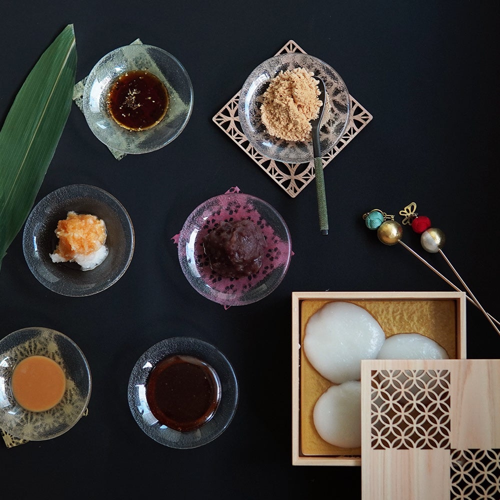 お餅に添える味は、人気ナンバーワンの「和三盆きな粉」をはじめ、「からみ餅(大根おろし)」や、「銀座 福祿壽特製のごまだれ」など和の風味豊かな6種類の中からお好きなものを3種お選びいただけます。