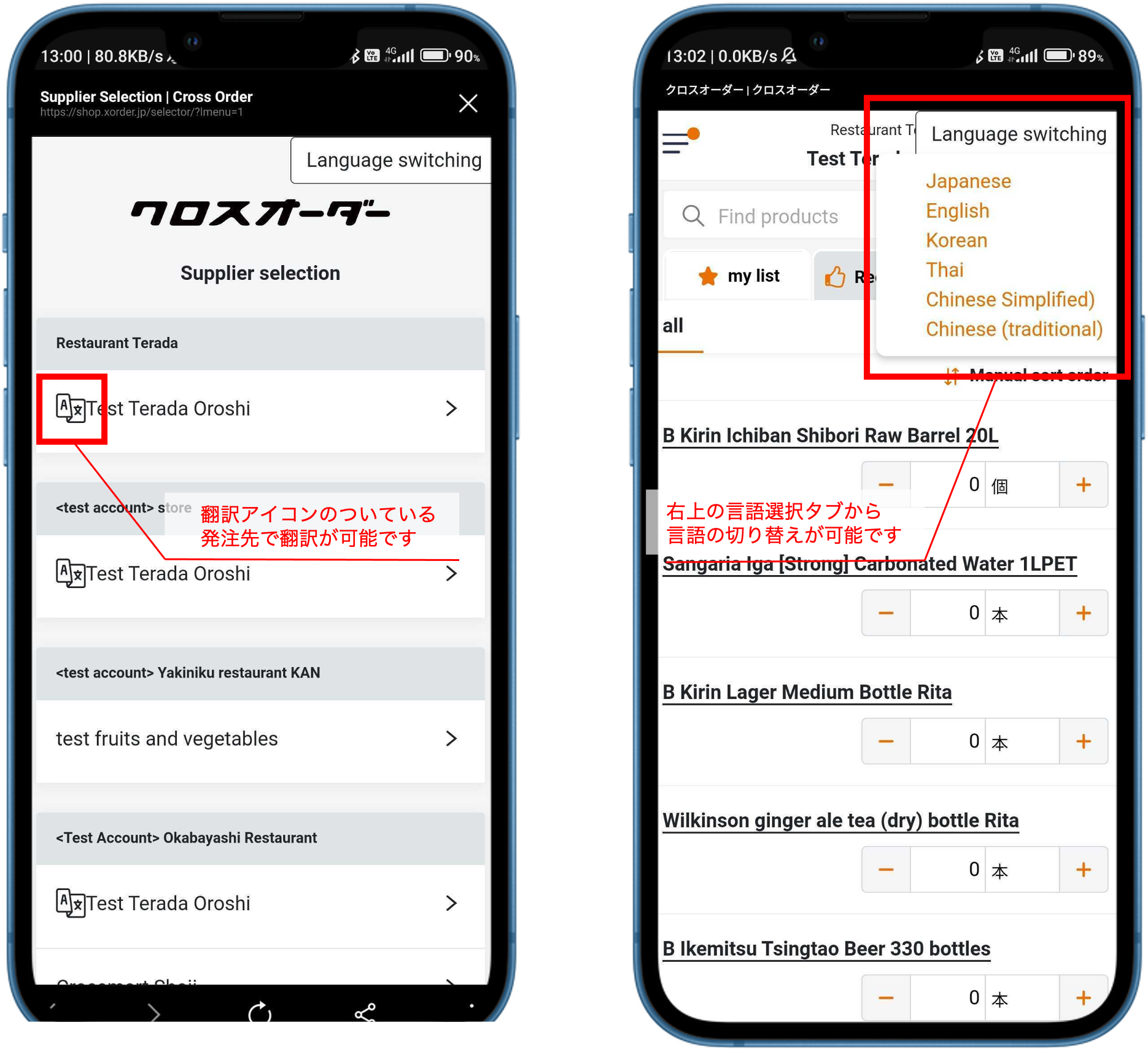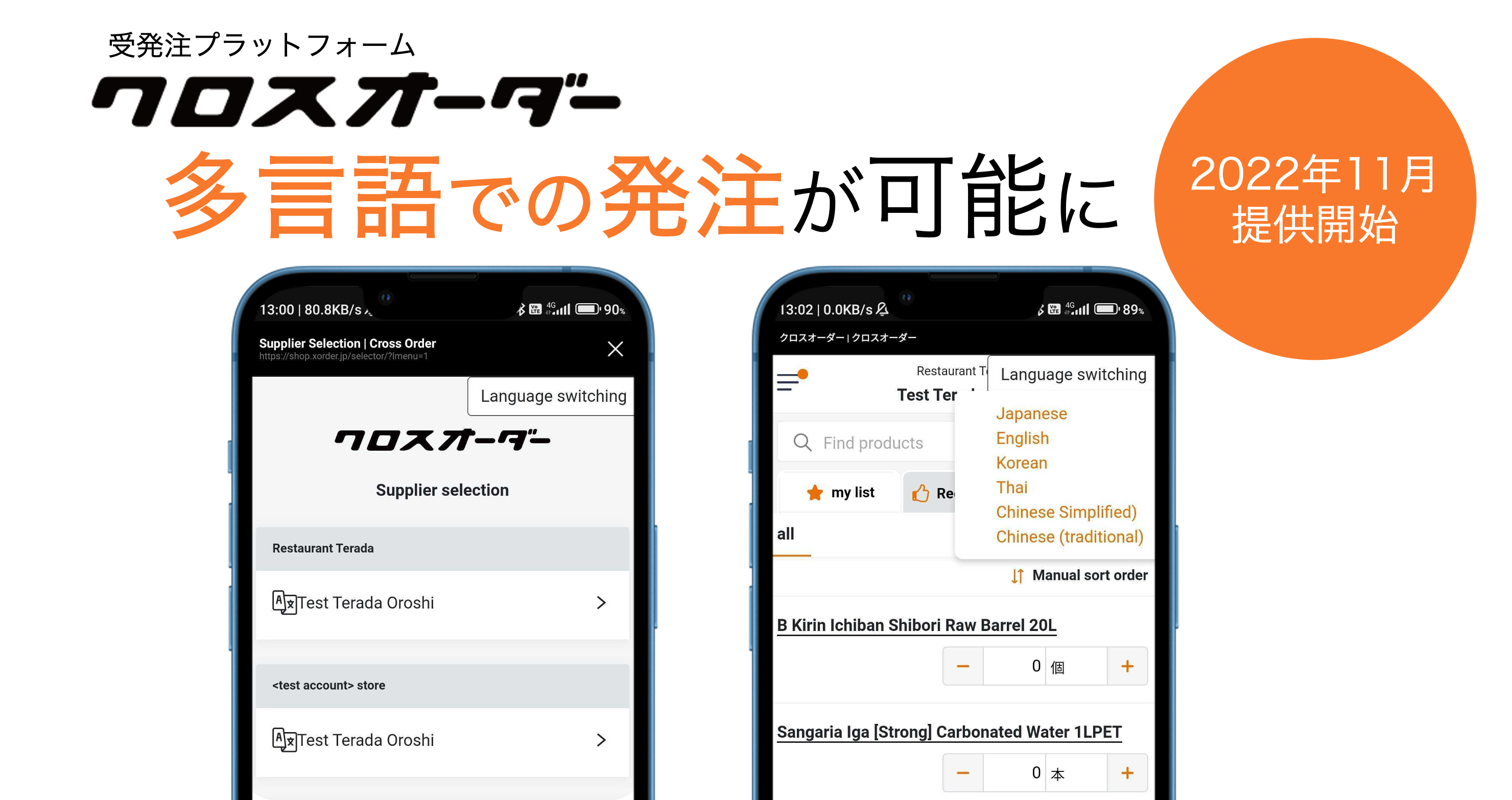 クロスオーダーを利用する飲食店様は、発注先の卸売企業様が多言語対応を導入している場合、特別な対応なくすぐにご利用いただけます。