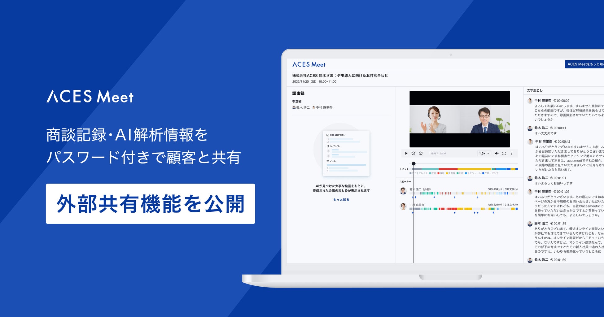 株式会社ACES(東京都文京区、代表取締役 田村 浩一郎、以下「ACES」)は、営業支援AIツール「ACES Meet」において会議の外部共有機能をリリースし、社内に限らず社外においてもスムーズな情報共有を行っていただけるようになりました。本機能により、顧客への議事録共有をリッチかつ簡易に行うことができます。また、会議の内容に関する認識齟齬を防ぐことができ、会議後のフォローアップをよりスムーズに行えるようになります。